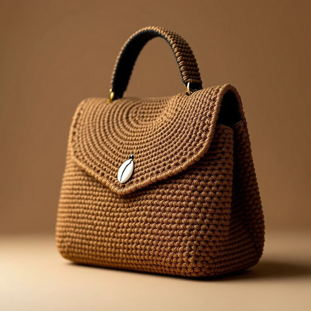 "A glamorous yet simple African-inspired crochet handbag, designed with elegance and cultural charm. The bag features a minimalist crochet pattern with clean lines and subtle textures, crafted from high-quality yarn in rich, earthy tones like deep gold, bronze, or black. It is adorned with small, elegant embellishments such as a single cowrie shell or metallic beads for a touch of refinement. The bag has a sleek, modern shape with a stylish handle, making it perfect for formal occasions. The background is neutral and sophisticated, highlighting the bag's timeless beauty and simplicity. "