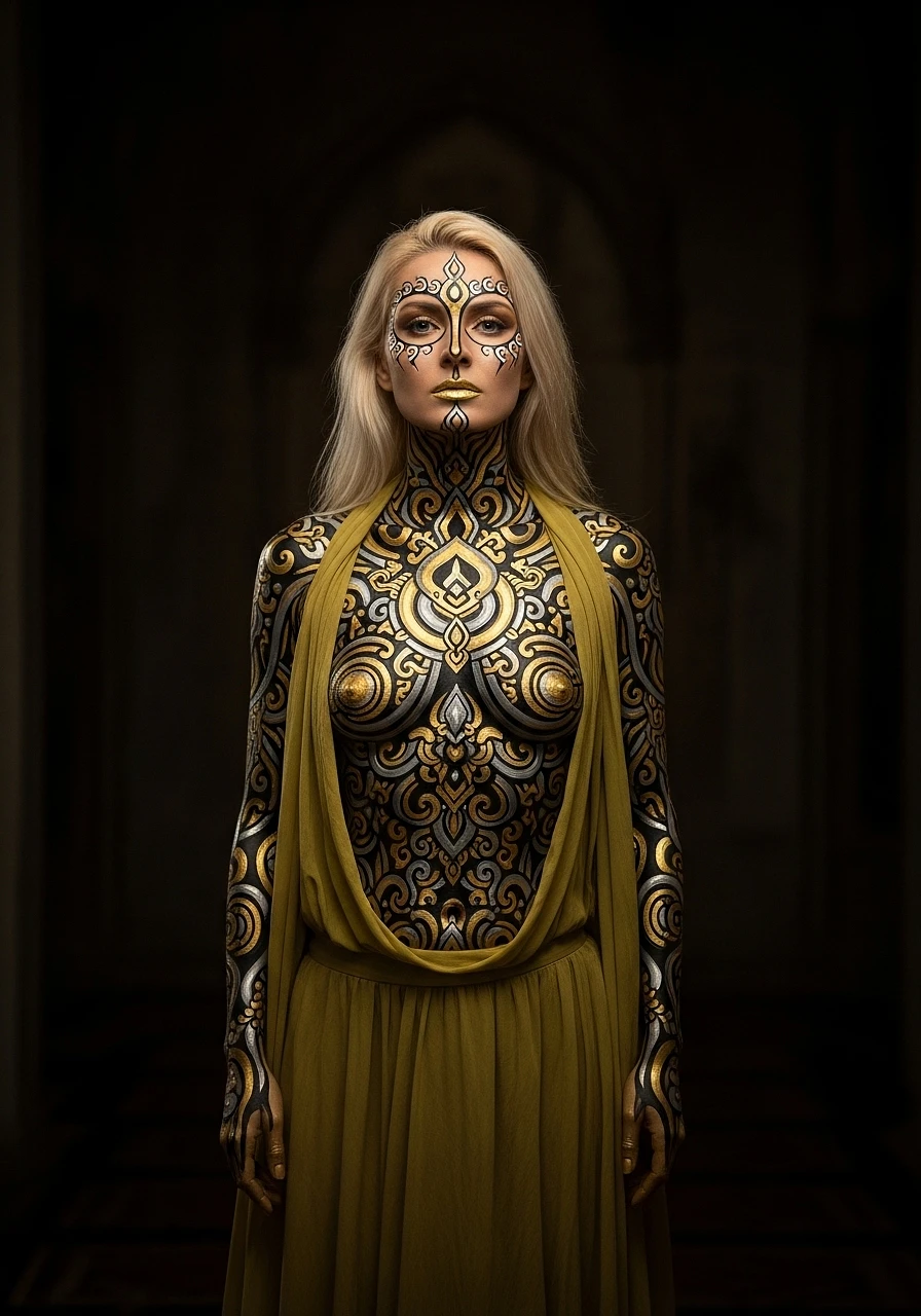 art vanuit een zijde belicht, art expressionistisch uitende magere olympisch kampioen fitness geheel in beeld, mooi blond haar, glans door olie, mager model is in olie doordrenkt doorzichtig transparant flies waar lichaam duidelijk doorheen komt, bij op de muren Tibetaanse woorden, made out of gold, in the style of dark balanced symmetry lovely silver tantra paterns bodypaint, in real gold, detailed facial features, organic forms, fotografie portraiture, complex patterns, staat in een groot marmer kathedraal, zeer donkere omgeving, weinig licht, vanuit een kant belicht, background Tibetaanse woorden dark, body geheel in beeld, bodyart photo, lichaam als kunst , --ar 1:2 --stylize 350 --c 2 --v 6. 0