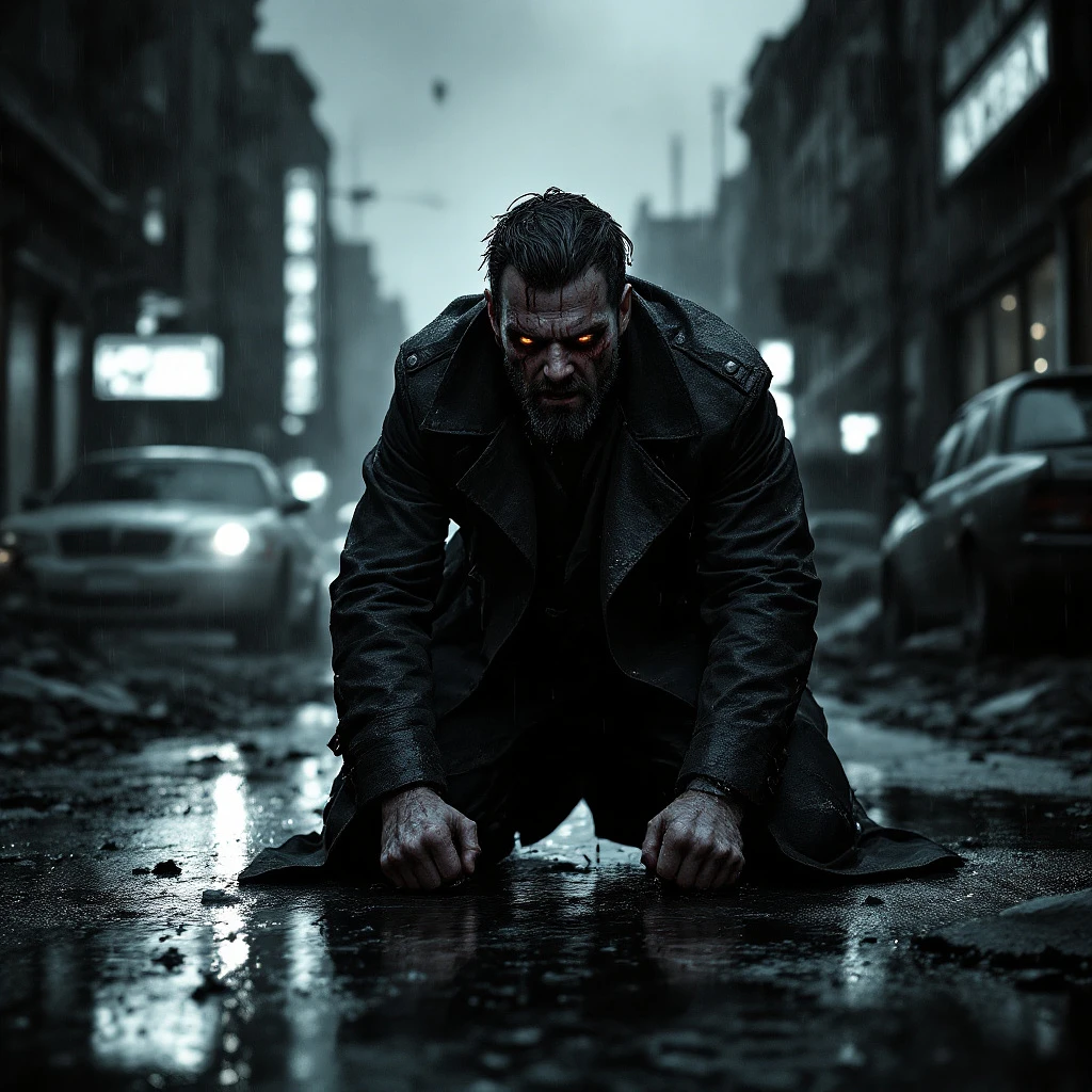 A battle-worn anti-hero kneels on a rain-soaked street, his face bruised and bloodied, eyes filled with pain and determination. His tattered trench coat clings to his body, soaked from the relentless downpour. The black and white background emphasizes his isolation, with flickering neon lights casting faint reflections on the wet pavement. His clenched fists tremble, showing both rage and sorrow as he struggles to rise. The ruined cityscape behind him looms, shattered buildings and abandoned cars hinting at a world that has turned its back on him. High-contrast lighting, dramatic shadows, cinematic composition, ultra-realistic, dark noir aesthetic, emotionally charged