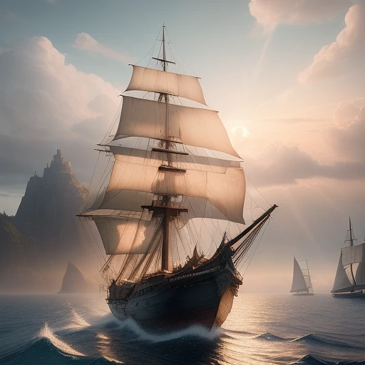 Photo of a ultra realistic sailing ship, dramatic light, pale sunrise, cinematic lighting, battered, low angle, trending on artstation, 4k, hyper realistic, focused, extreme details, unreal engine 5, cinematic, masterpiece, art by studio ghibli, intricate artwork by john william turner