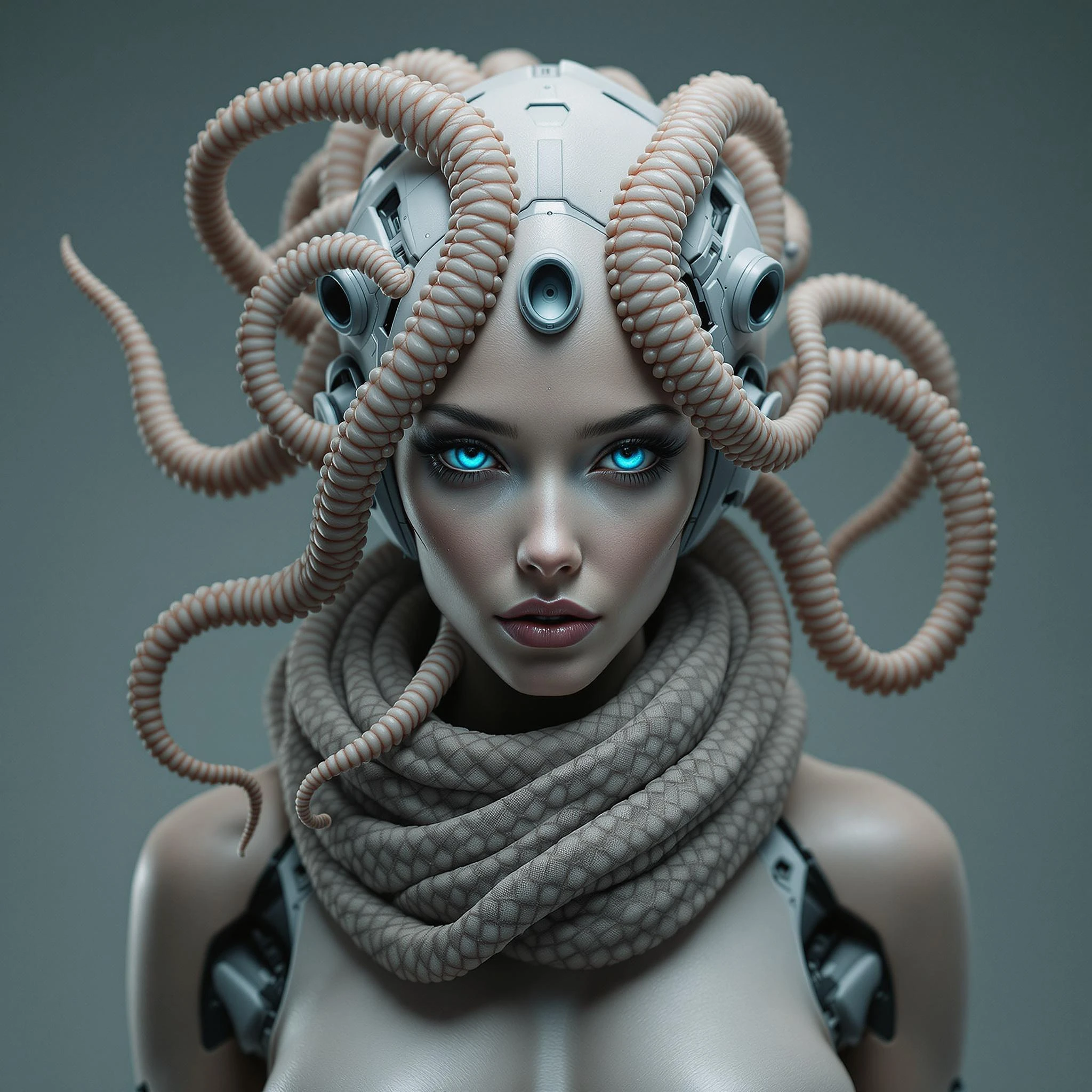a woman with blue eyes and a robot head with an octapus on her forehead tentacle draping like hair and creating g a scarf around her neck , Android Jones, computer art, cybernetic, Full Body Picture, studio lighting.