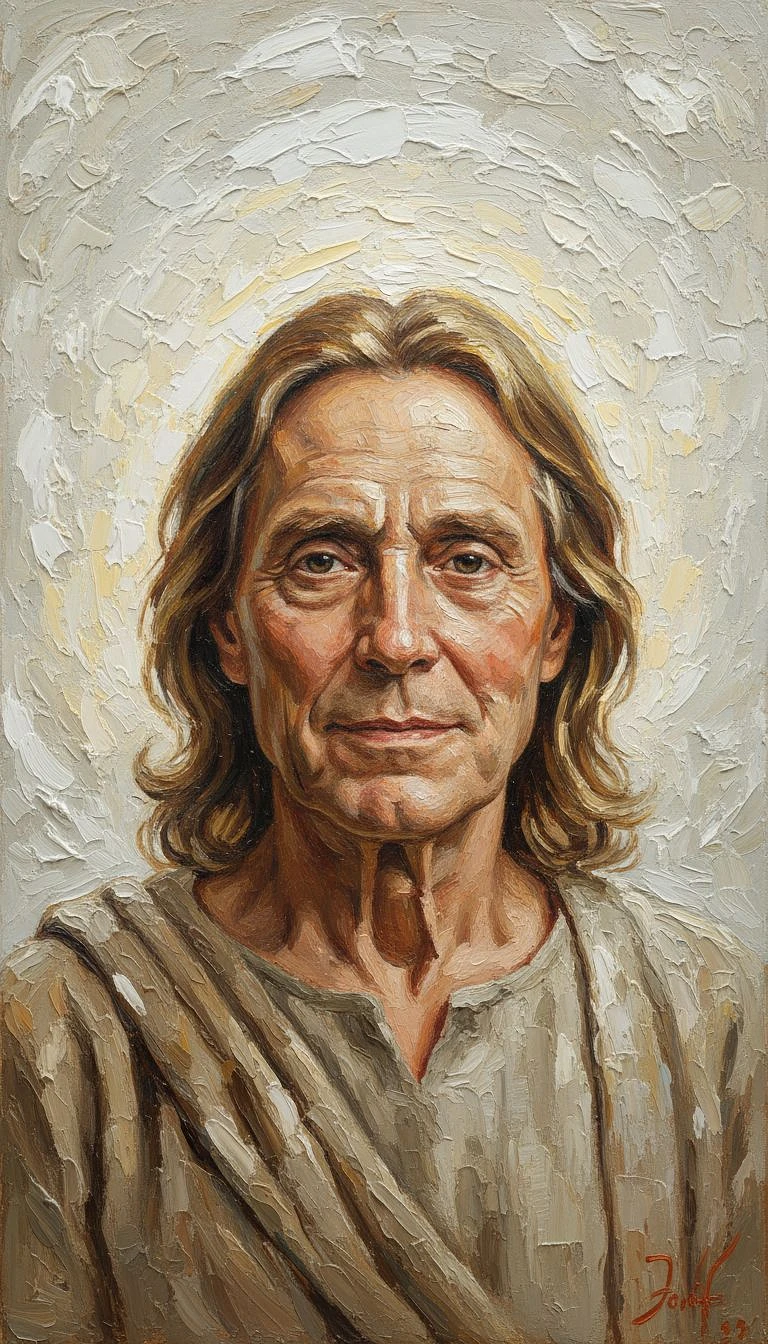 A highly detailed oil painting in the style of Jesus with a gentle, compassionate expression and warm, inviting eyes. His face is serene, conveying peace and understanding. The background is textured with g brushstrokes in white tones, characteristic of jesus style, perhaps subtly hinting at a starlit sky or a halo effect. Jesus's hair is flowing and light brown with hints of gold, and he wears simple, earthy robes. The brushstrokes are thick and vibrant, with rich impasto texture emphasizing divine light and a sense of warmth and comfort. his age is 66