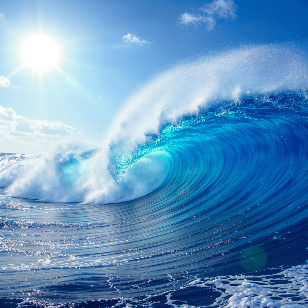 UNA IMAGEN DEL MAR MUY AZUL TUMULTUOSO CON GRANDES OLAS ,SOL DE FONDO COLORES BRILLANTES , FOTO PROFESIONAL DE GRAN TAMAÑO PARA POSTER PUBLICITARIO ESTILO WIDE SCREEN, QUE SEA MUCHO MAS REALISTA Y LA FOTO MIRADA DESDE LA PLAYA VACIA, FOTO ESTILO WALLPAPER 3440 PIXELES DE ANCHO POR 1440 PIXELES DE ALTO