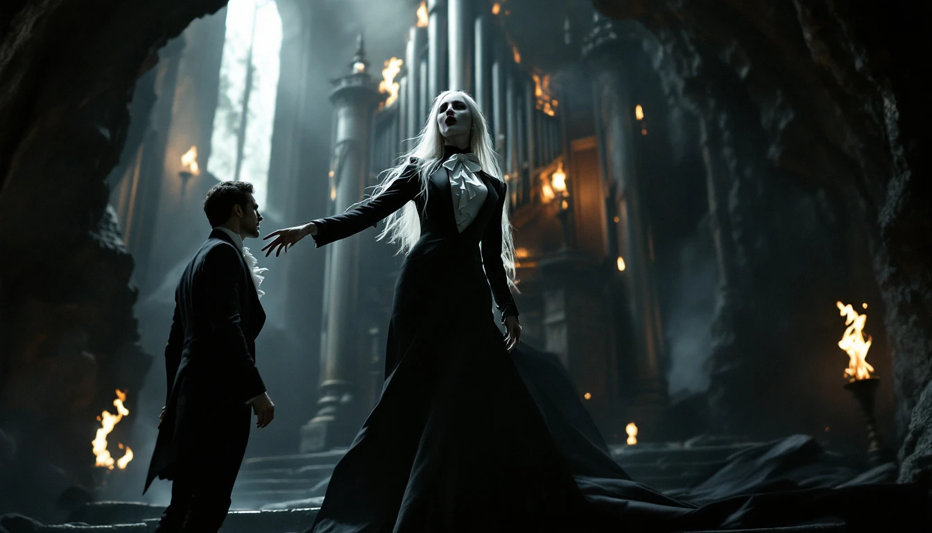 phantom of the opera, Woman, tall, slender, long legs, long white hair, right side of face is severely disfigured by fire, she wears a fitted tuxedo, white shirt and white bow tie, long flowing black skirt four inch black stilettos are visible, she sings in an operatic style, arms wide, in a gothic lair , cave with a large pipe organ. extreme wide to show entire body. A handsome man in nineteenth century formal wear stands five feet behind her mesmerized by her singing.