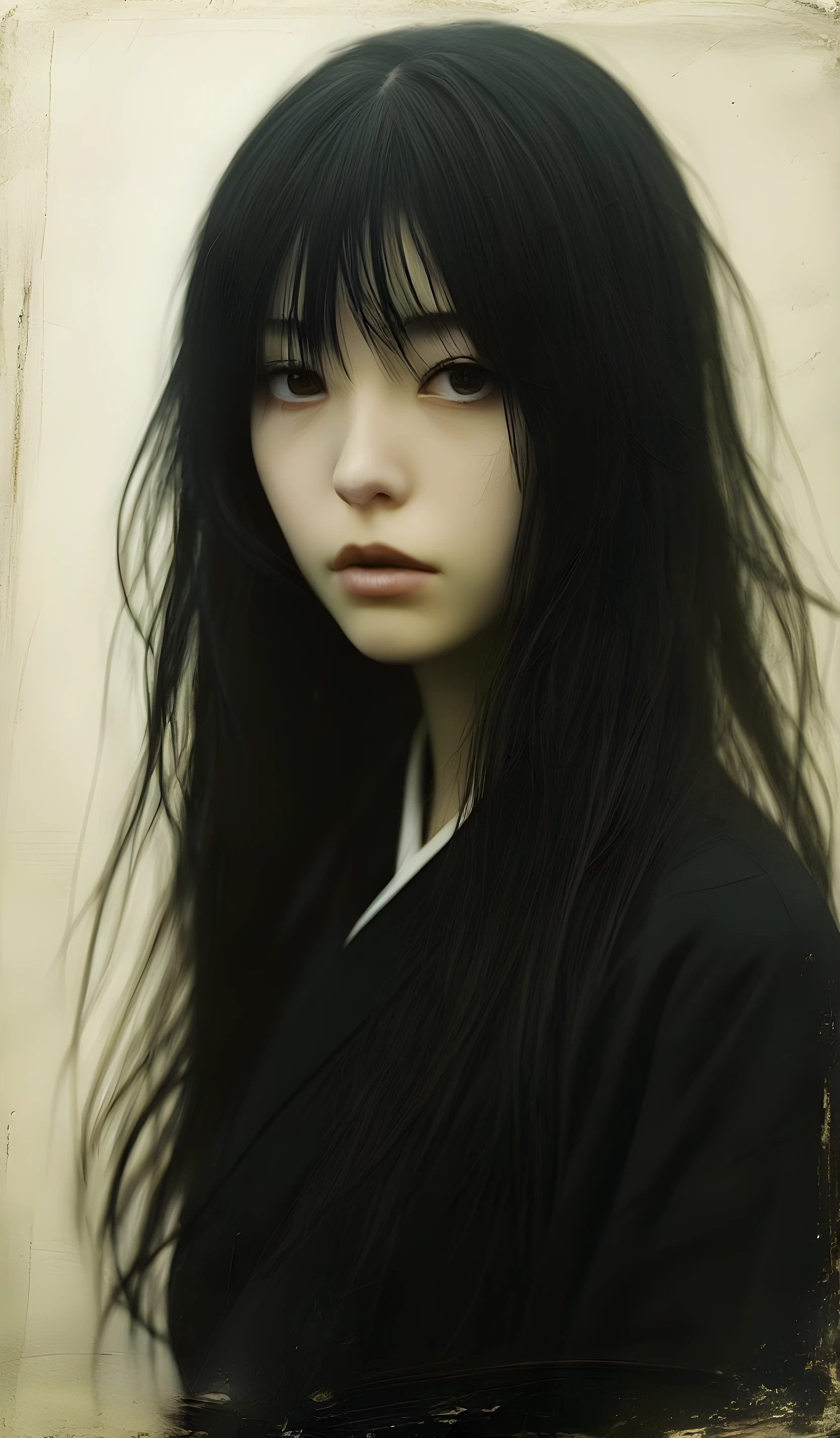 aged photograph of an asian female figure, ethereal and otherworldly presence, long dark hair obscuring face, pale skin and sunken features, faint hint of malevolent expression, hazy and indistinct edges, ominous, Japanese horror inspired, traditional Japanese aesthetic, moody and atmospheric, digital painting in the style of Takeshi Obata and Yoshitaka Amano