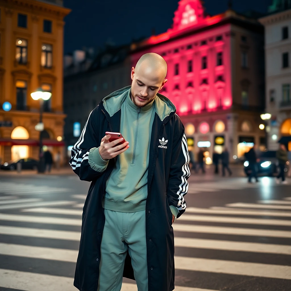 A young, slim man with pale skin, bald head, and a little beard, engrossed in his iPhone 15 Pro at Jelacic Square in Zagreb. He is clad in a stylish pale army green Adidas tracksuit paired with an oversized black Adidas raincoat with white stripes on the sleeves, complemented by Adidas superstar sneakers. The bustling Zagreb street background features midnights lights and buildings, with the bald young slim man standing on a pedestrian crossing. Captured in high-quality 16mm on Fujifilm X-Pro3 at f_stop 16. 0 and a focal length of 24. 0, emphasizing the intricate details of the scene. street style, long shot technique, low angle photograph, medium shot, upper body, long exposure lighting