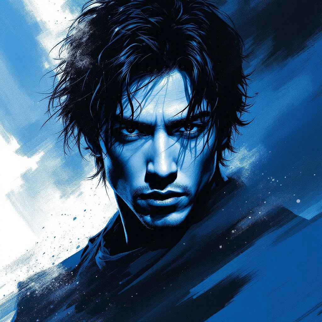 movie poster, male character in black, white and blue, in the style of yoh nagao, light-focused --ar 71:128 --stylize 750 --v 6