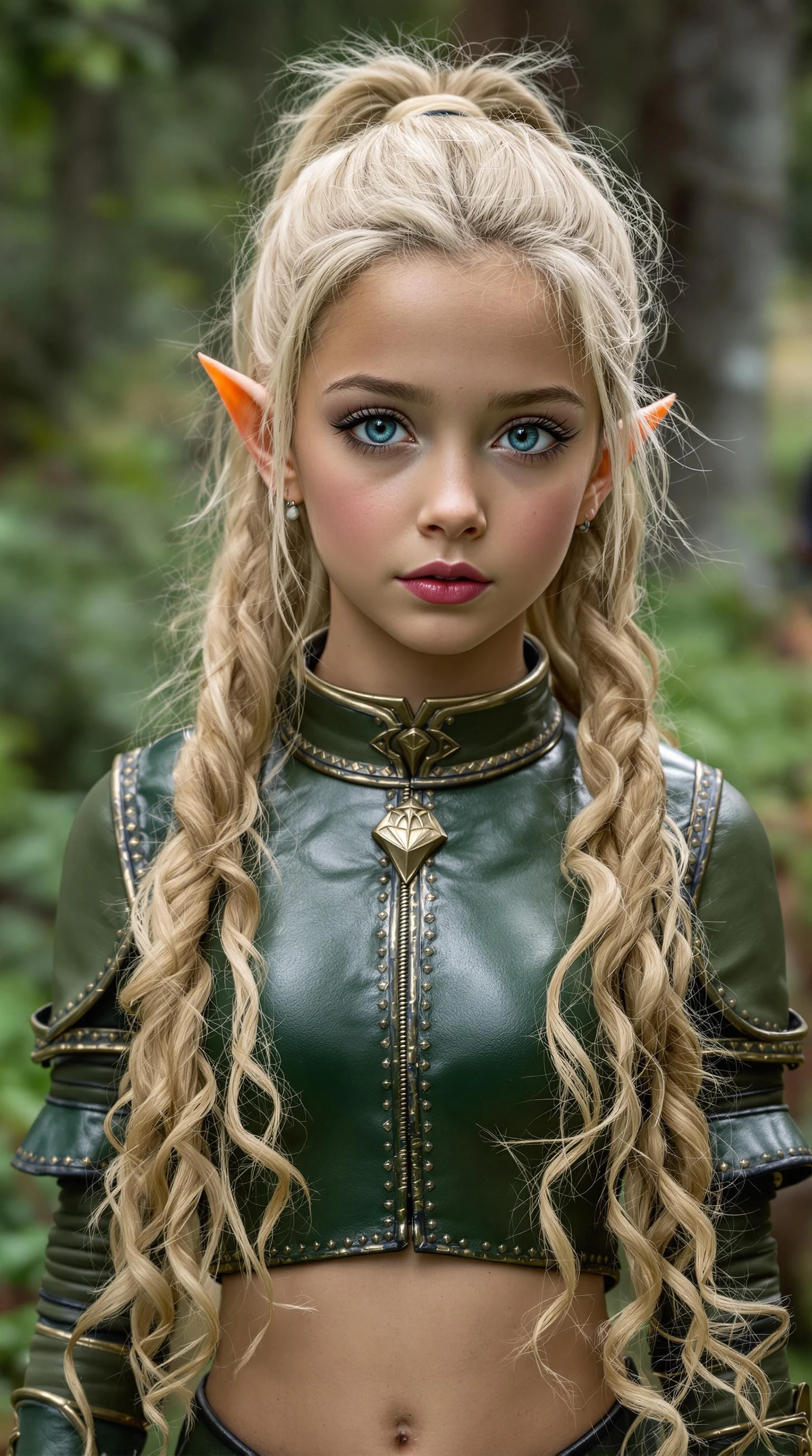 a professional photo of a exceptionally beautiful girl in the world (age 7) , (seven year old) short eared elf, in a highly detailed, futuristic, (futuristic) , (masterpiece) , (realistic) , (perfect by age anatomy) , (Full body) , (viewing from head to feet) with extremely long hint of gold blonde curly hair in a ponytail, beautifully flawless olive skin, thick black eye liner, extra long eye lashes, light pink blush, extremely beautifully shaped lips with light pink lipstick, blue eye shadow, perfectly flawless olive skin, beautiful perfect high cheekbones beautiful perfect high cheekbones extremely detailed large perfectly shaped beautiful brilliant Forest Tea blue-brown-golden-grey-purple eyes, beautifully manicured fingernail with pink polish, Wearing a green leather armor midriff showing belly shirt, tight fitting forest green leather armor leggings, (in the style of world of Warcraft) in a forest, magical, mystical, high depth of field, gentle expression, 8k, (high res) , ultra-detailed, photo-realistic, full image view, full body view, front view, highly detailed, volumetric, dramatic lighting