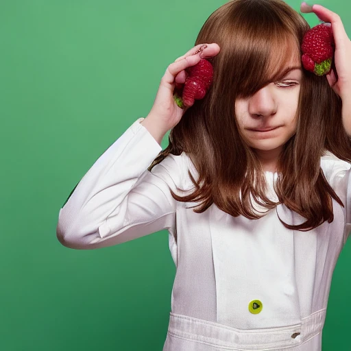 girl with a mouse under her arm, with white jumpsuit, on a green background, with short brown hair and light bangs, with raspberry earrings, 3d