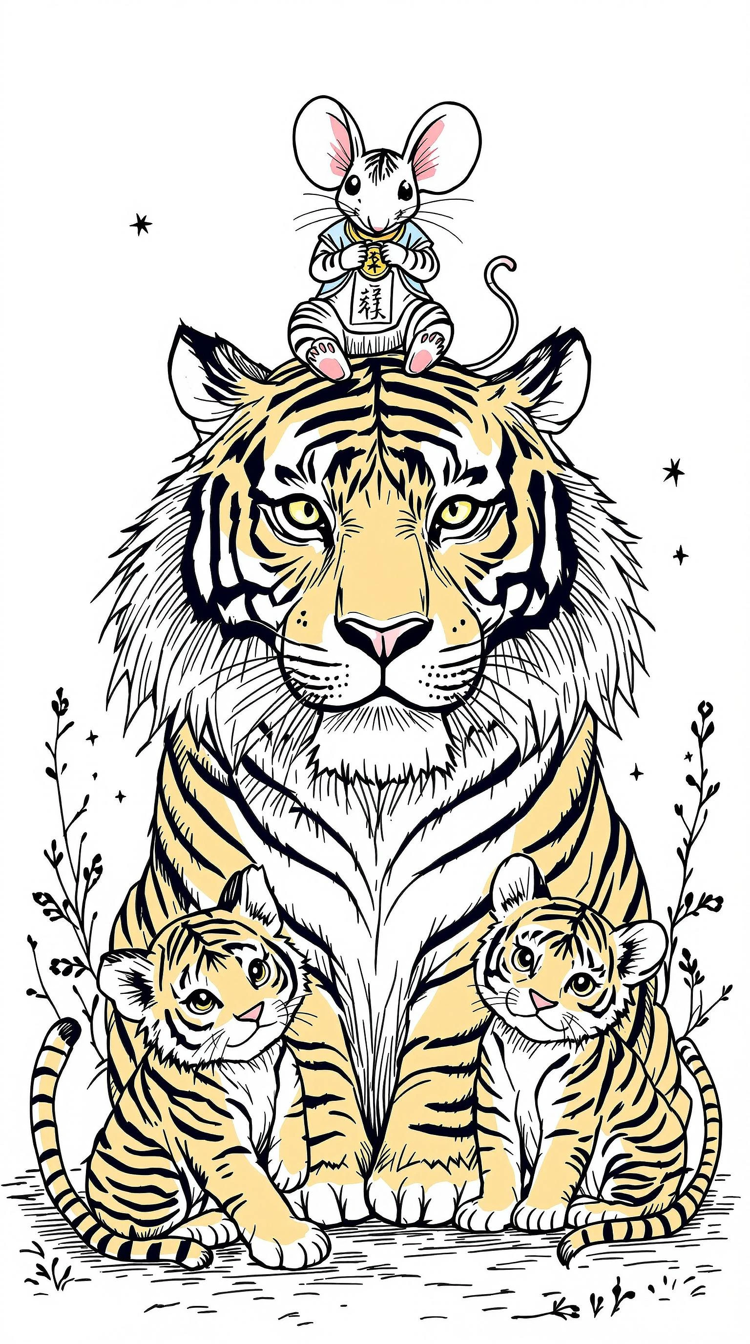 Doodle Art, a tiger and two tiger cubs, and a oversized mouse , with a mouse on the tiger's head, the mouse holding a talisman,