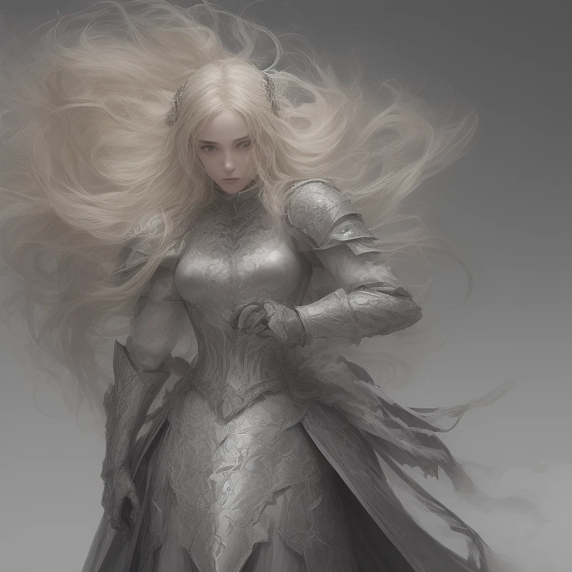 /imagine The image depicts a woman in a fantasy setting, dressed in armor and holding a glowing sword. The woman has long, flowing blonde hair that appears to be blowing in the wind. Her attire consists of a suit of armor that is predominantly silver in color, with a high collar and a decorative design on the chest. She wears a flowing skirt or cape that is a darker shade of silver, and her sleeves are long and fitted. Her hands are clad in silver gauntlets, and she holds a sword in her right hand. The background of the image is dark and misty, with large rocks or boulders visible in the distance. The lighting is dramatic, with a bright light shining down on the woman from above, casting a glow over her armor and sword. The overall effect is one of power and strength, as if the woman is a warrior or a hero in a fantasy world.