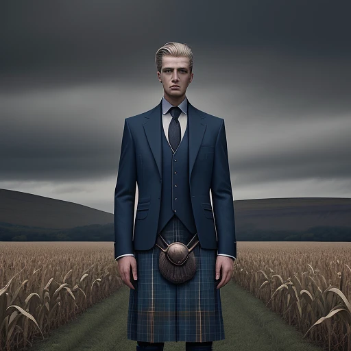 High resolution photography a man stands with his head down in some tall corn, in the style of fashion photography, scottish landscapes, light bronze and dark blue, deconstructed tailoring, genderless, close-up shots, brooding mood --ar 132:161 --s 750 --v 5. 2