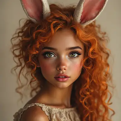 Realistic photograph of a girl, with bunny ears, Brown skin, big eyes and curly orange hair, with intricate detailing on her full body suit, a half body portrait. -ar 4:5 --v 6. 0 --s 750