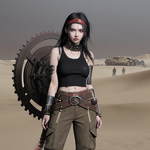 absurdres, highres, emo girl_ (Black Hair with red streaks) , Red Eyes, post apocalyptic mechanical wasteland, sand dunes, ancient machinery, giant gears, cogs, bolts, sandstorm, dystopian, cargo pants, tank top, bandana, belt, straps, buckles, leather bands