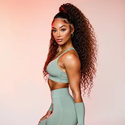 A photorealistic image of stunning and curvaceous Latin woman with glowing caramel skin. Her long, curly hair cascades down naturally, framing her face. Her gaze is sultry and inviting with smoldering eyes and a confident expression. Wearing a figure-fitting yoga outfit—a matching sports bra and high-waisted leggings in a soft pastel color accentuating her curves, emphasizing her ample chest, narrow waist, rounded hips and thick thighs. the scene is illuminated by soft, diffused lighting with sharp details, cinematic depth, and rendered in 4K resolution.