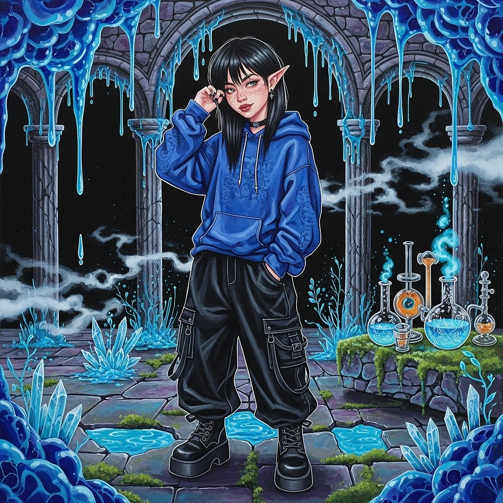Encaustic art painting. 12-year-old fair pale-skinned Vietnamese elf girl with freckles. Wearing comfy colored-goth emo-core streetwear. Setting is an otherworldly liminal mystical alchemical space with aspects of indoors/outdoors and nature. Vibrant Saturated Color Squishy Gel Sapphire theme. Coy mischievous flirtatious expression. Nostalgic expression. Setting, black void space