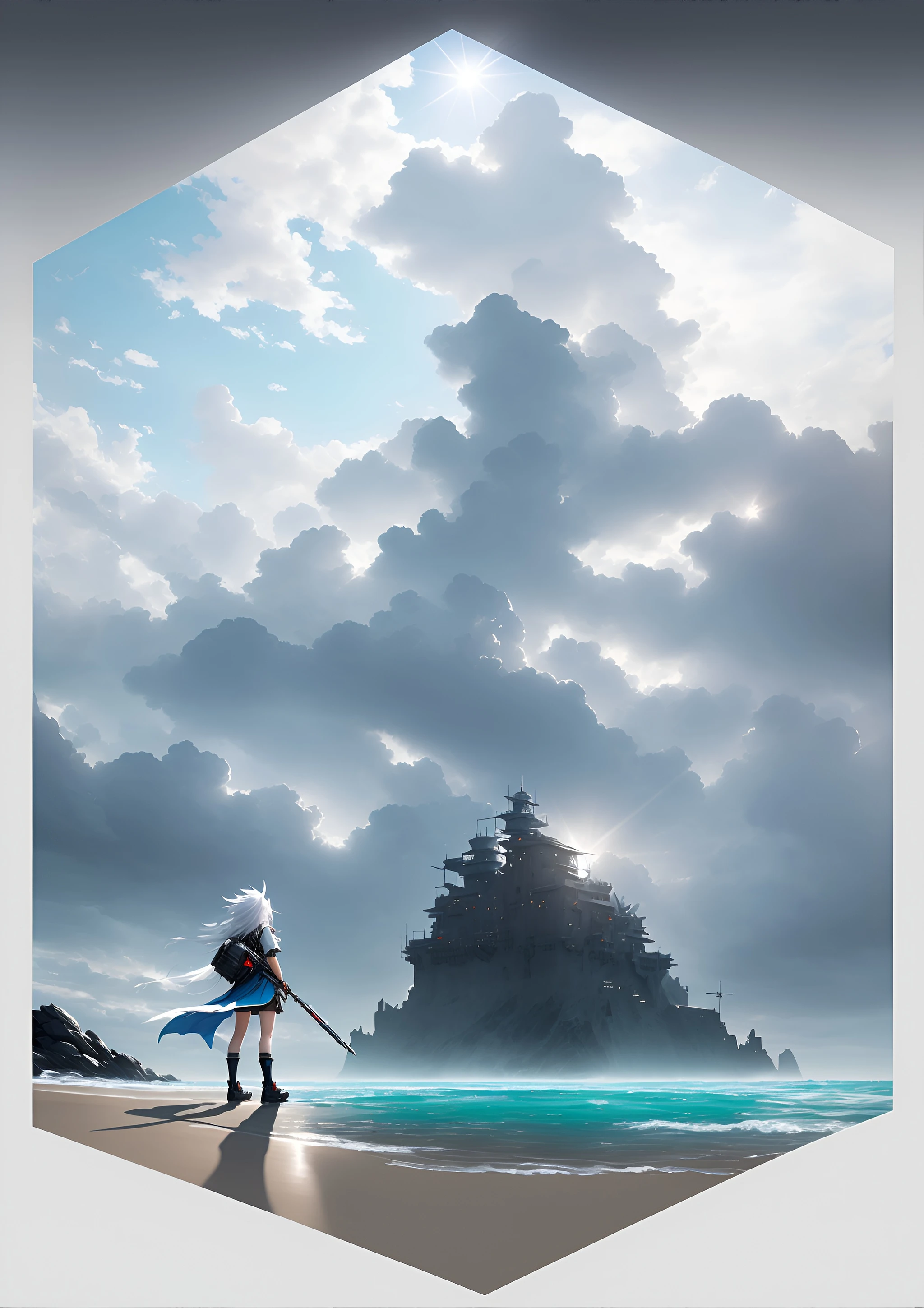 masterpiece, concept art, splash art, white background, Arknights inspired, mid shot, a girl, standing, beach, sun, sea, cloud, bright sky, fortress, panoramic, award winning, professional, character design,