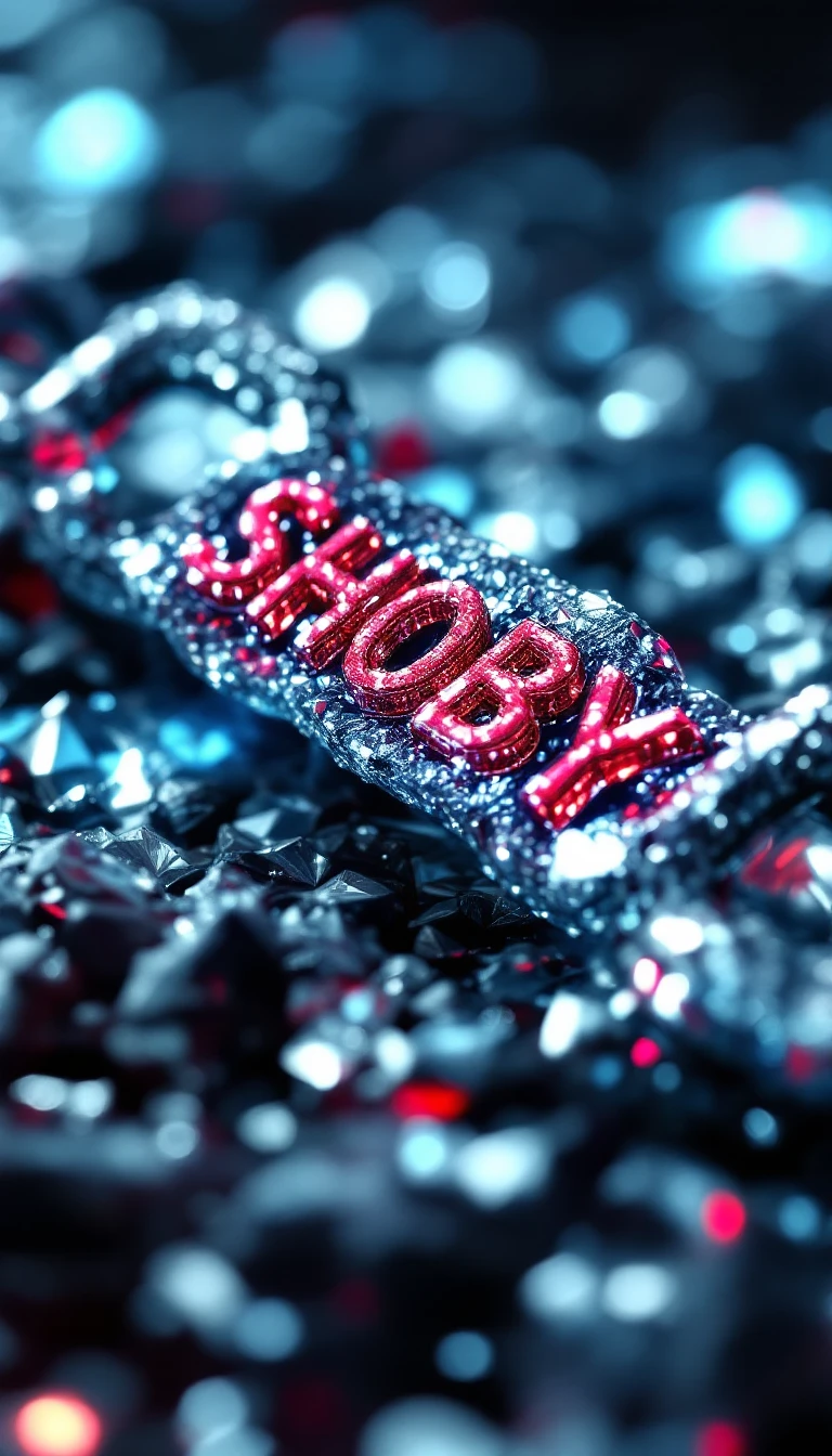 big diamond ice out cuba chain. On the Chain is the text: SHOBY" in a abstract red diamond font style. Focus on the chain. Ultra hd