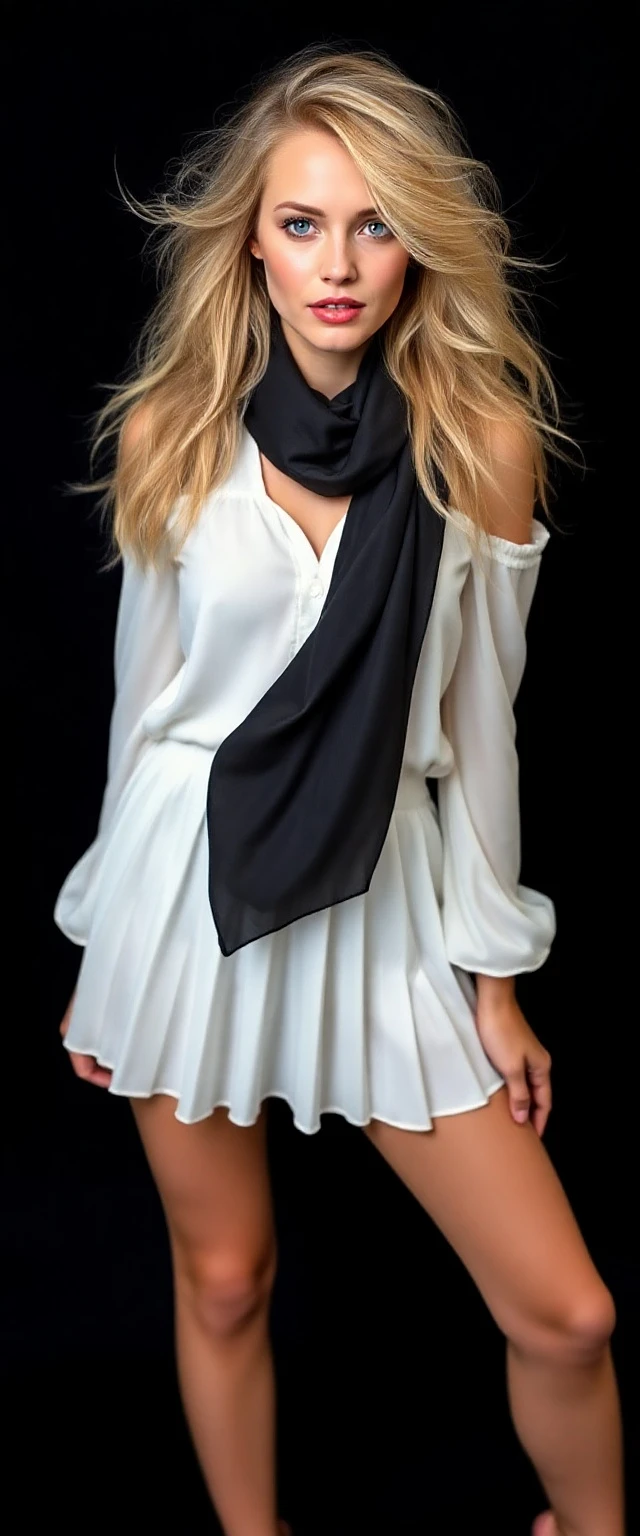 "High resolution full body portrait photograph, Sony A1 50. 1MP, 26mm lens. Fair-skinned supermodel, early 20s, heart-shaped face, tousled windswept honey blonde hair. Vibrant blue-green-silver eyes, pink lipstick, subtle makeup. Black silk scarf, white off-the-shoulder silk blouse, pleated white mini skirt, high heels. Soft pastel colours, soft box lighting, deep black background. editorial style photography. "