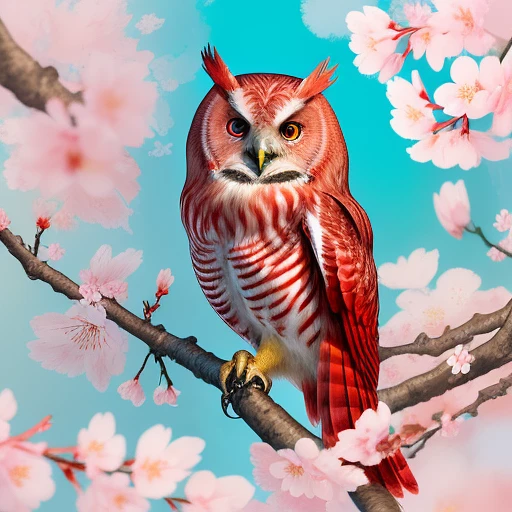 High resolution An illustration of a red owl with bright blue eyes in the style of abstract expressionism in a beautiful cherry blossom crisp and clear high resolution 8k