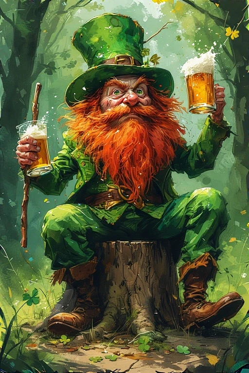 an ugly leprechaun with a red beard and a mug of beer in one hand is beating himself by a stick in another hand sitting on a stump in the forest, a watercolor illustration in style of Herluf Bidstrup for St. Patrick's Day, Weird Al Yankovic, taken in the mid 2000s, grainy, taken on a 2000s Camera, realistic, hyperrealistic, very realistic, highly detailed, very detailed, extremely detailed, detailed, digital art, trending on artstation, headshot and bodyshot, detailed face, very detailed face:: --ar 1:2 --v 4