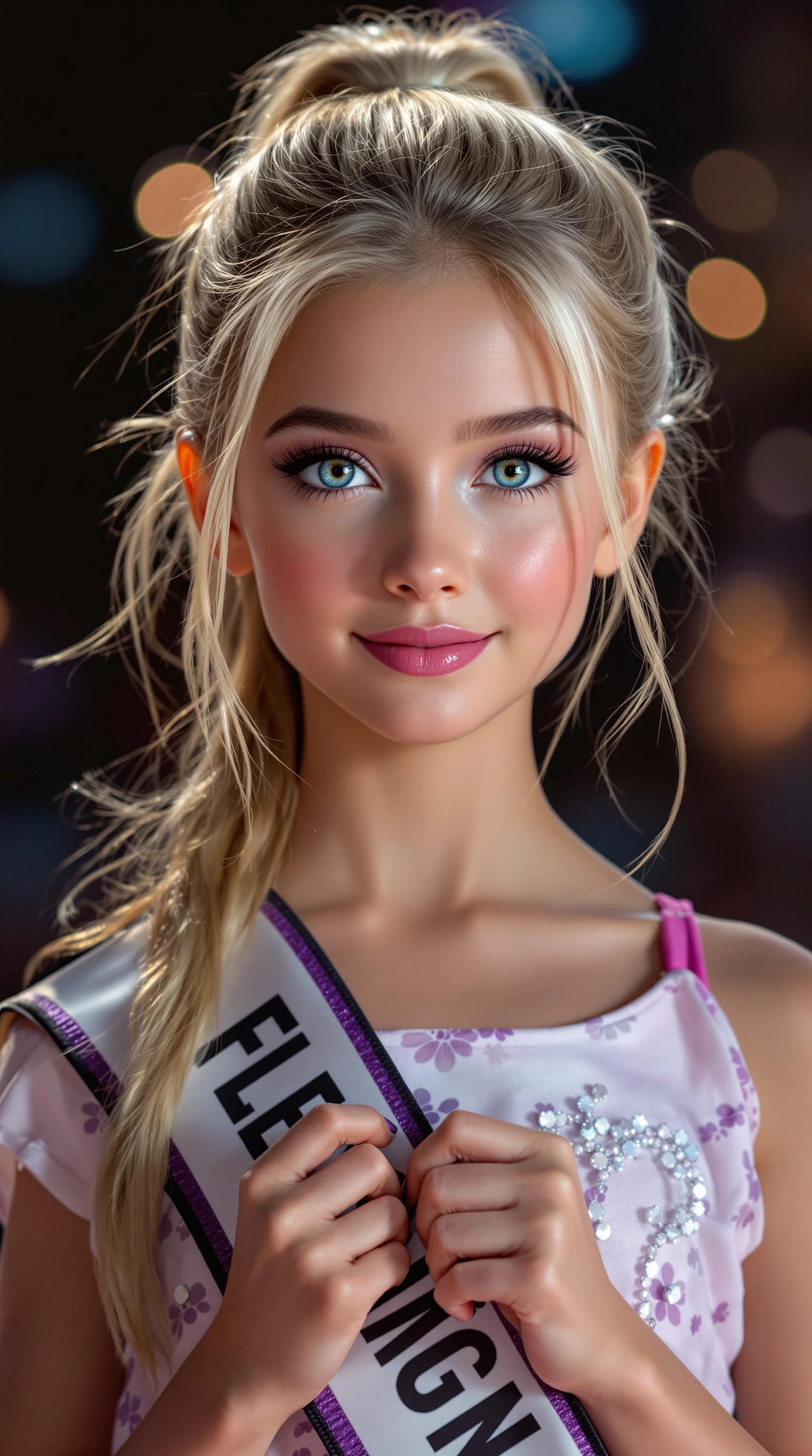 djrny-v4 style, score_13, score_28_up, score_37_up, A stunning professional photograph capturing the world’s most beautiful fourth-grade girl as she takes part in a beauty pageant. This highly detailed and lifelike image presents her full body, highlighting her long sandy blonde hair pulled back into a ponytail and her flawlessly smooth light olive complexion. Her makeup is expertly applied, featuring bold black eyeliner, exceptionally long lashes, a soft pink blush, perfectly shaped lips adorned with light pink lipstick, and striking dark purple eyeshadow. Her olive skin is immaculate, accentuated by elegantly sculpted high cheekbones. Her large, brilliantly shaped eyes reveal a rare forest tea blue-grey-purple shade, depicted with extraordinary precision. Her fingernails are meticulously manicured with purple polish. Dressed in everyday clothes of her choice, she stands confidently on stage, gazing directly at the camera. The photograph boasts a high depth of field and is crafted using Unreal Engine 5 and Octane Render, delivering an ultra-high-resolution image filled with intricate details and razor-sharp focus. This top-quality 8K resolution photo-realistic image offers a full-body frontal view, enhanced by dramatic volumetric lighting and flawless graphics. Negative prompts ensure the exclusion of Asian features, low resolution, text, errors, cropped images, poor quality, and various anatomical flaws such as extra or mutated limbs, poorly drawn features, and watermarks or signatures.