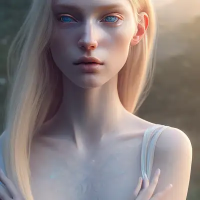 Pale skin woman with blue eyes and blonde hair wearing plunging dress, soft smile, photorealistic, high resolution, unreal engine, 8K resolution, Cinema 4D, Behance HD, Unreal Engine 5