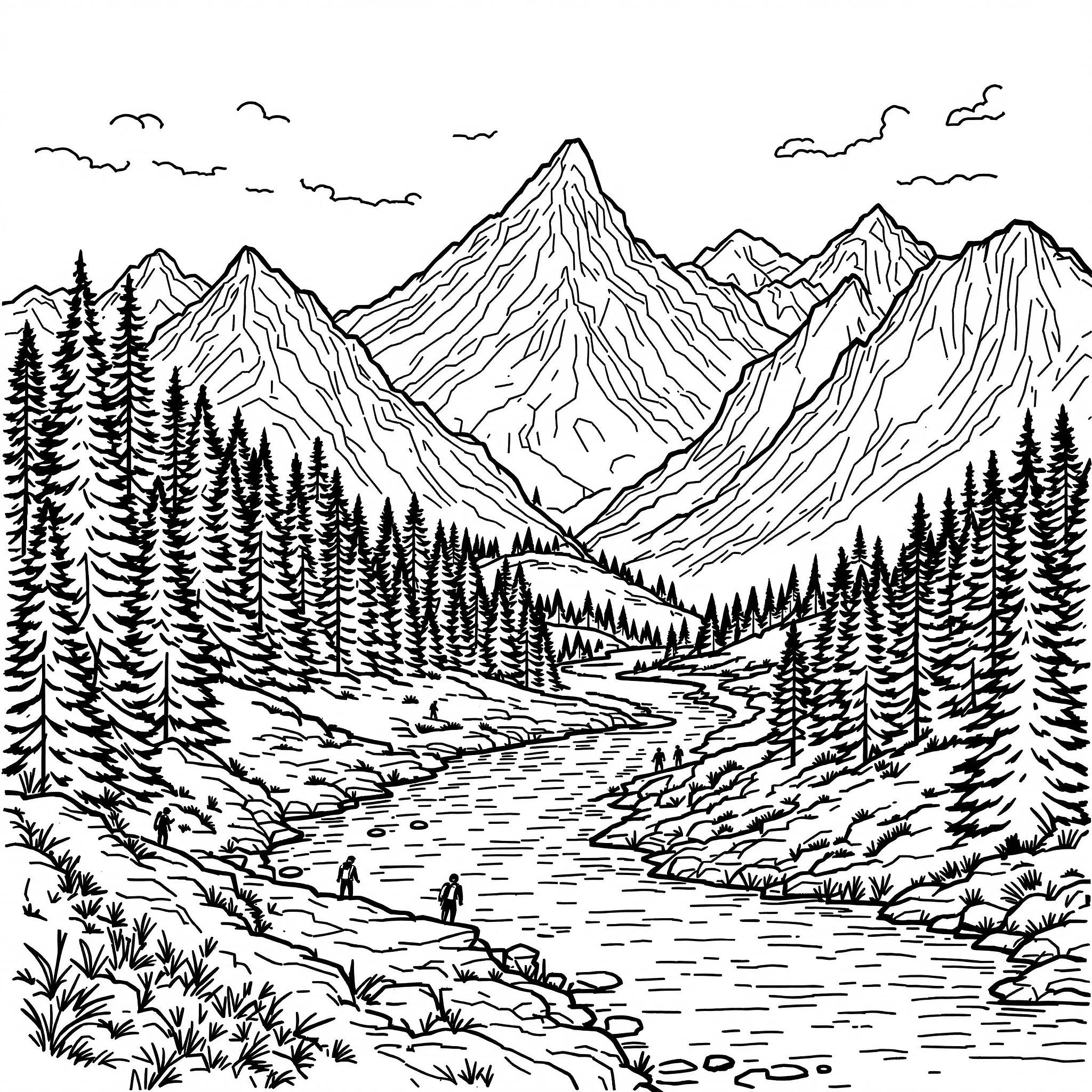 High-resolution black-and-white line drawing of a mountain landscape: Include mountains, trees, a river, and hikers. Ensure the drawing is in a style suitable for coloring, with clear lines and no filled-in black areas.