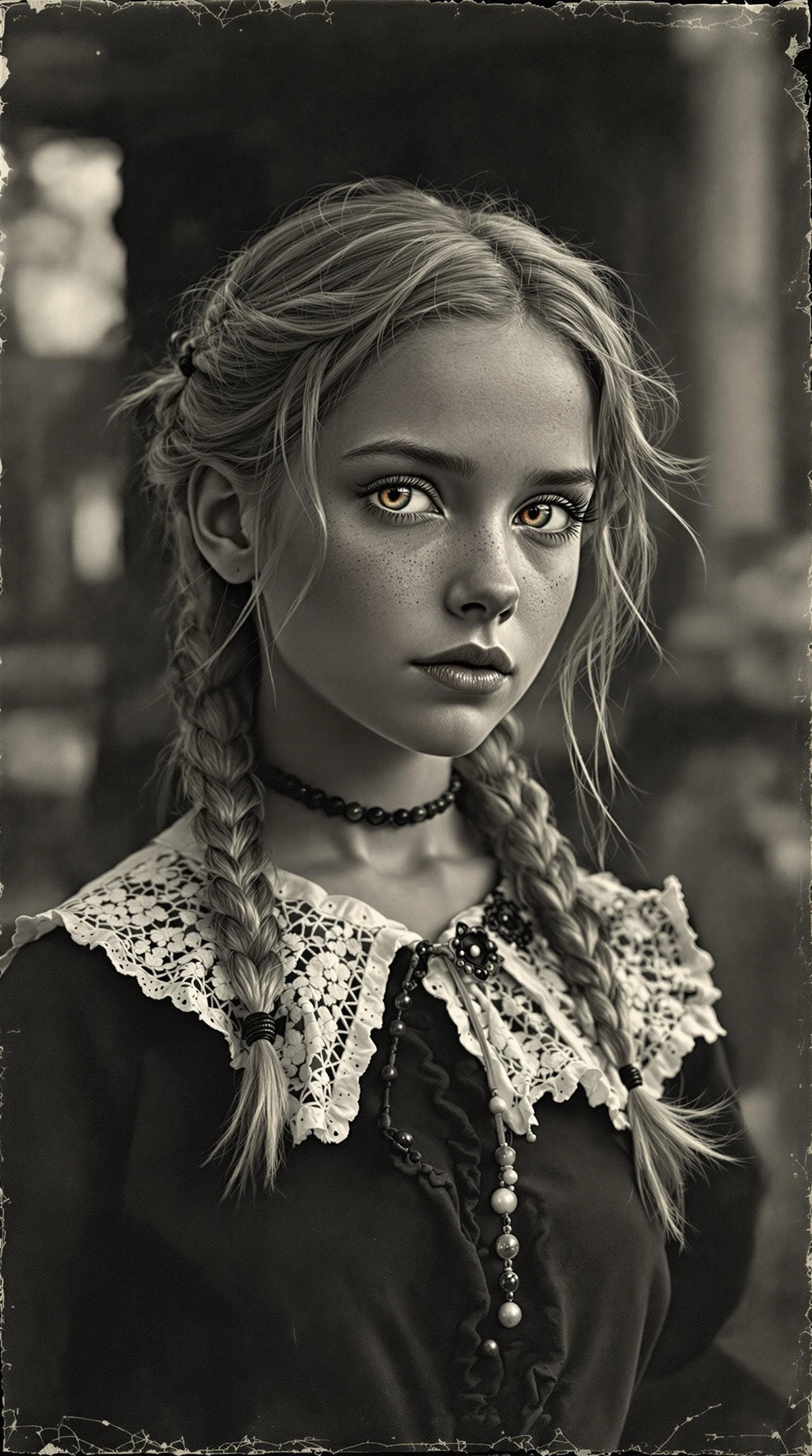 a professional vintage black and white photo (photo paper have aged aged over time) , of a exceptionally of the most beautiful witch girl (age 7) in 1880's during the Salem witch trials, (futuristic) , (masterpiece) , (realistic) , (perfect anatomy) , (viewing from head to knees) with extremely long hair blonde tied back in a ponytail Village Massachusetts, large beautiful detailed eyes brilliant Forest Tea red-green-blue-silver-brown-golden-grey eyes, with long eye lashes, flawless olive skin, (dressed in the style of the 1680's during Salem witch trials) Standing outside under a tree's shade, In front of her colonel house, (8k) , (high res) , ultra-detailed, (photo realism:1.5) , (photo realistic:1.4) , high contrast full image view, full body view, front view, hyper-realistic lifelike texture highly detailed, volumetric, dramatic lighting