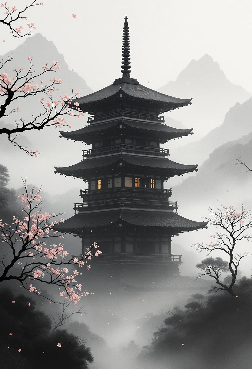 Traditional Japanese pagoda in a foggy, ink wash-inspired landscape. Use a muted monochrome palette with soft grays and blacks, and a minimal touch of warm amber glow inside the windows to suggest faint interior light. The environment should feel painted and atmospheric, with fog blending into subtle mountain silhouettes in the background. Include light falling cherry blossoms and minimalist tree branches fading into the mist. No strong highlights or contrast — the entire scene should feel soft, cinematic, and timeless, like a traditional sumi-e scroll with a quiet spiritual mood.