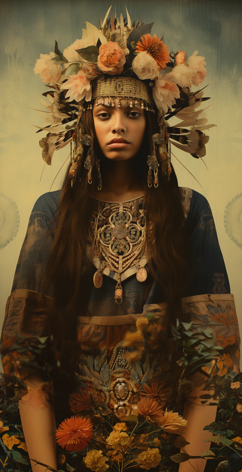 A woman in the style of "Karencore", wearing an ornate headdress, holding wildflowers and dressed in tribal garb, with an earth tone background, vintage screen print look, collage art, mixed media collage, 35mm photography, vintage film poster. --ar 99:128 --s 250 --v 5. 2
