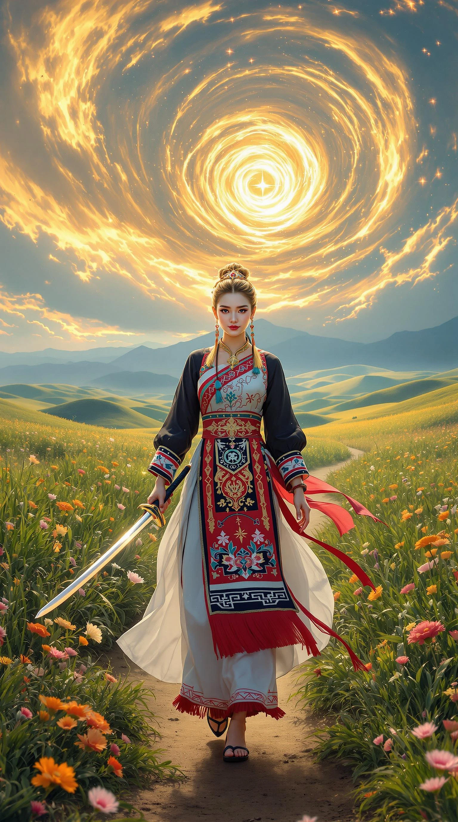 A woman in traditional Vietnamese (likely H'mong) attire, walking on a dirt path amidst a field of tall grasses and hills. The woman is light-skinned with light blonde hair, wearing a detailed, vibrant, embroidered, and beaded dress in shades of white, black, coral, and turquoise. The dress has a distinctive patterned, embroidered, and beaded apron-style panel with tassel embellishments. The top is black with embroidered details and fringe. The headdress is a detailed woven crown embellished with fringe and beads that complement the dress's colors. The setting is a rural landscape, featuring rolling green hills under a vibrant sunny sky with a hint of clouds. The colors are bright and vivid, emphasizing the intricate details of the traditional attire against the natural backdrop. Hyperrealistic style, focusing on the intricate details of the garments and the texture of the fabrics. The light should be soft, highlighting the embroidery and beaded work. Include clear shadows to ground the image and add depth to the scene. The grasses and hills should be rendered with realistic textures. This sacred meadow, bathed in soft, golden light that descends from a sky painted with the fiery hues of dusk and dawn, is alive with mystical energy. Ancient Hmong symbols, holographic and ethereal, float in the air around her, swirling and intertwining in living, hypnotic designs. Ethereal fireflies, fueled by divine energy, flit through the wildflowers, while glowing embers dance on the gentle breeze. A soft, almost imperceptible hum fills the air, a resonating symphony of the earth's energy and the princess's power. The ground, covered in soft moss and wildflowers of unimaginable color and depth, shimmers under the ethereal light. Above, a swirling vortex of storm clouds punctuates the golden sunrise, creating a dramatic contrast against the radiant aura that surrounds the princess. Partway through the storm clouds, one sees an aerial view of a Hmong warrior, circa 40s, in a dynamic combat stance. His rich bronze complexion and elongated features mirror the princess's connection to ancient strength. He wears traditional Hmong attire with intricate red and white embroidery, a meticulously crafted long black silk gauze shirt with contrasting red embroidered patterns on the cuffs, hem and sash cascading down and around his legs. The light catches the intricate white, pink, and green patterns on his belt, adding to his powerful aura. The warrior's gaze follows the princess, a silent respect bordering on worship. Her enchanted katana, glowing with an ancient power, soars in the sky, a silver streak of incandescent energy slicing through the mist and clouds, a sword born of myth itself; she is the embodiment of a soaring, celestial warrior. The distant view of an ancient battlefield or lost kingdom, shrouded in swirling mist, hints at the epic destiny that awaits them, their path marked by glowing ancient symbols and energy trails. The scene crackles with otherworldly energy, blending dynamic realism with hyper-realistic details and a symphony of light and shadow, showcasing the interplay of human strength and divine power through the mystical lens of ancient Hmong lore.