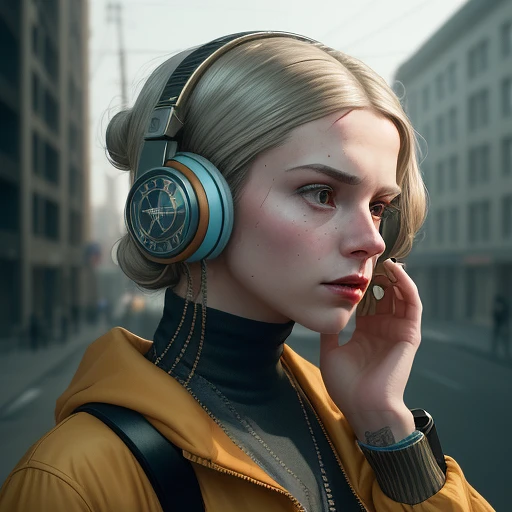 Modern, 2020s, detailed cinematic shot from, realistic cinematic scene, An Hipster woman adorned in streetwear attire, The vintage headphones. Covering her ears, holding her hair back, Singing like nobody is watching, showing detailed intricate work, shot in the style of wes anderson and stephen king, oscar winning photography, striking image captures, meticulous attention, stunning costume design/popart style with punkcore [young-woman] , short-haired, sunglasses drip off her face (((Drip_effect) )), magazine style in background [graffiti] character trending on artstration, Set in the modern day, this cinematic scene showcases an enigmatic woman adorned attire, cinematic, ultra-detailed
