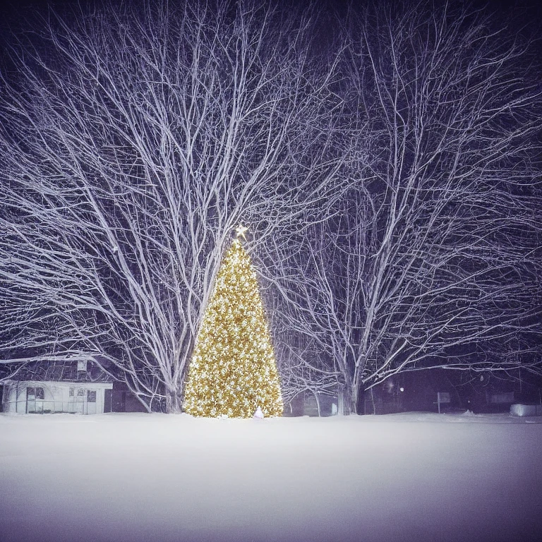 Huge Christmas Tree with tousands lights in a town with lot of snow in the style of Gregory Crewdson, cinematic, spooky, night, foggy,