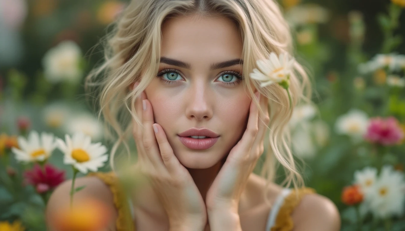 Uma linda jovem de 20 anos de idade, com cabelos castanhos claro e olhos verdes, no meio de um lindo jardim de flores margaridas , A jovem está fazendo biquinho de beijos com seus lábios para o expectador. --ar 16:9 --v 5 --ar 16:9 --ar 16:9 --ar 16:9 --v 5 --ar 16:9