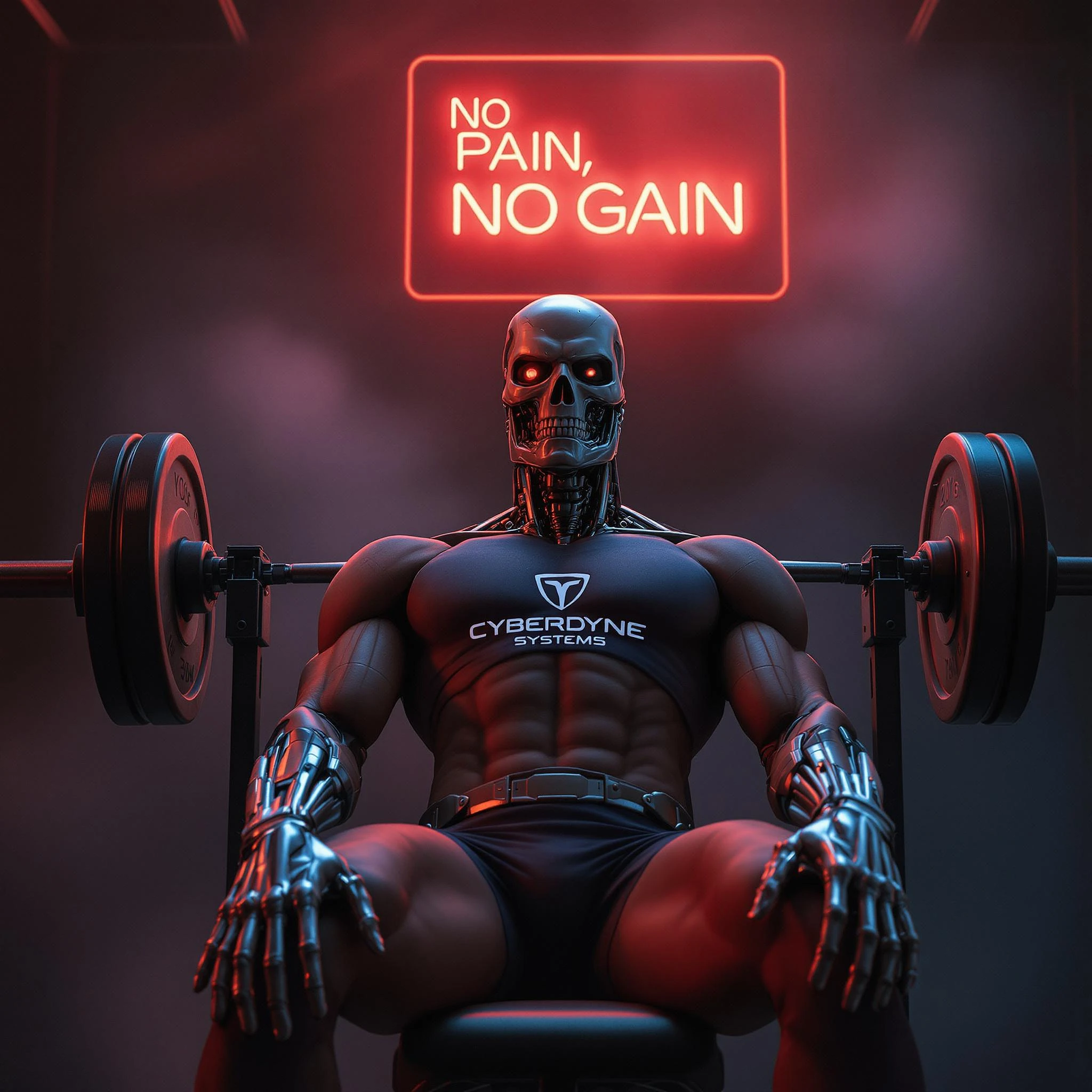A hyperrealistic 1980s-style cinematic scene showing the Terminator from The Terminator movie seated on a bench press machine during a pause between sets in a classic 80s-style gym. He is wearing a retro, tight-fitting muscle shirt with the Cyberdyne Systems logo prominently displayed on the chest. The shirt clings to his powerful frame, with every muscle beneath the fabric well-defined and emphasized, exuding a sense of raw strength and precision. Paired with this, he wears classic 80s-style athletic shorts and high-top sneakers, completing his iconic look. The Terminator's hands rest powerfully on his thighs, palms relaxed yet strong. His hands are large, with anatomically correct features: five fingers per hand, detailed knuckles, visible veins running over the muscular surface, and a subtle metallic sheen emerging at the knuckles and joints where his advanced robotic endoskeleton is exposed beneath the skin. The transition from organic skin to advanced metal is seamless, smooth, and polished, reflecting the advanced engineering of his design. The bench press barbell is loaded with four 20 kg weight plates on each side, emphasizing his commitment to a heavy lifting session. The gym itself is a nostalgic retro 80s masterpiece, with atmospheric lighting, iconic retro gym equipment, and a gritty yet motivational ambiance. In the background, a single glowing neon sign prominently displays the phrase 'No Pain, No Gain' in large, bold lettering. This sign is the sole text in the scene, casting a vibrant neon glow that reflects off the misty air and gym equipment. The gym environment itself remains free of additional text or signs, focusing purely on atmosphere and mood. Sarah Connor, portrayed by Linda Hamilton, is performing yoga gracefully in a classic 80s-inspired fitness outfit—high-waisted spandex leggings, a vibrant crop top, leg warmers, and a retro headband. Her movements are precise and elegant, embodying strength, discipline, and style as she stretches through a classic yoga pose. She is softly illuminated by the neon reflections, creating a seamless blend of atmosphere and aesthetics. The gym is enveloped in a misty, neon-lit ambiance. Volumetric lighting breaks through the haze, casting sharp, dramatic beams of light that illuminate the Terminator's muscular physique, his partially metallic features, and Sarah Connor's graceful yoga practice. This lighting creates an atmospheric, cinematic experience, highlighting the retro-futuristic nature of this 80s-inspired scene. Every detail is rendered in stunning hyperrealism—the texture of the muscle shirt, the glint of polished metal peeking through the skin, the alignment of weight plates, the folds of Sarah Connor's classic 80s outfit, and the soft glow of neon reflections. The scene evokes a retro action nostalgia while focusing on the Terminator's mechanical determination and Sarah Connor's strength and poise. This immersive 1980s cinematic masterpiece is a detailed vision inspired by the classic action film aesthetic.
