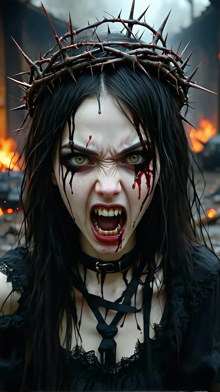 3d model, a beautiful skinny furious goth girl with a crown of thorns, more spikes puncturing her skin, drops of blood running down her forehead, her eyebrows are elaborately plucked, her eyes are full of pain and hate, her mouth with black painted lips shows an endless scream of pain and rage alike in the style of realistic and hyper-detailed renderings, anime-inspired characters, realistic portraiture, the background shows war scenes and intense combat footage heistcore, dragoncore, realistic figures, delicate realism, dark colors