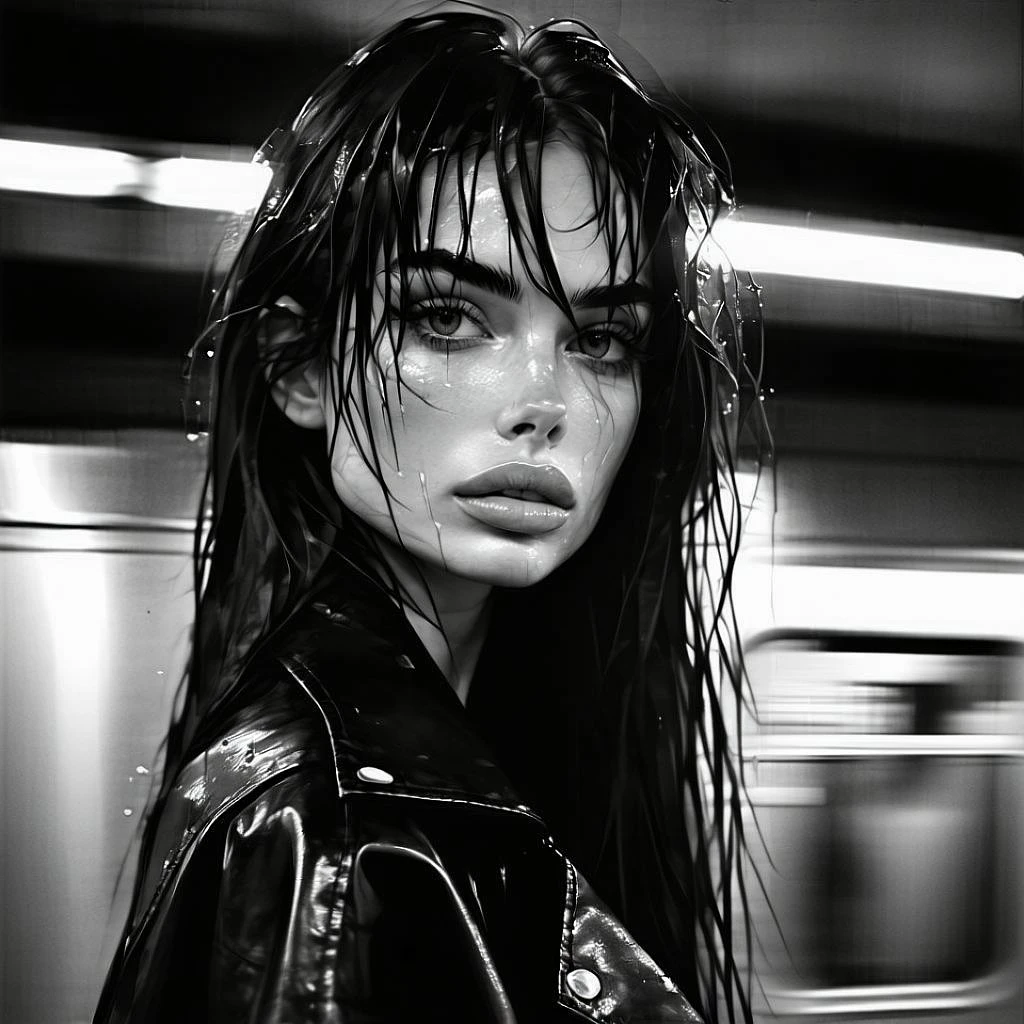 a woman with long hair in a subway station, in the style of black and white imagery, gritty hollywood glamour, made of glass, soft femininity, exaggerated facial features, wet-on-wet blending, captivating gaze --ar 71:128 --stylize 750 --v 6