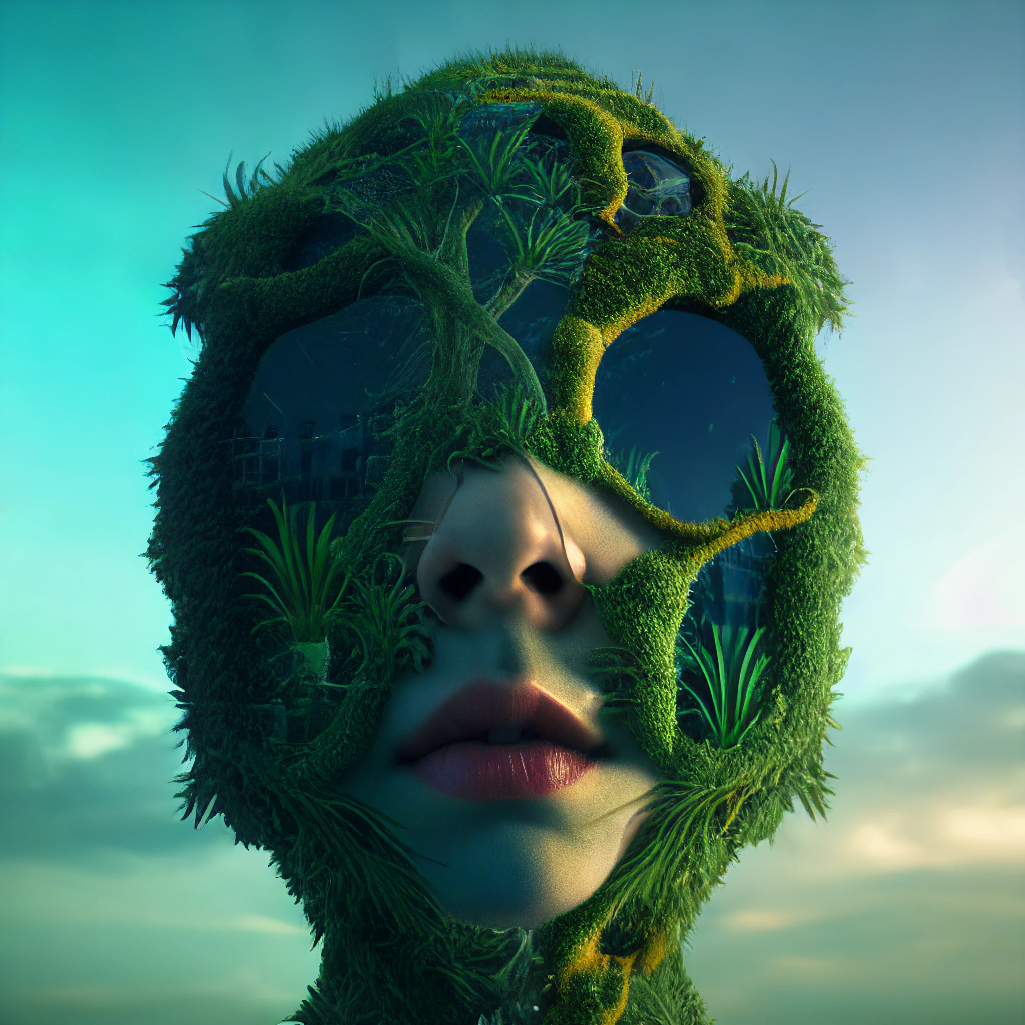 human face, rich vegetation, hyperfuturistic, intricate puzzle, surreal clouds, fission reactor, gloomy, scifi vibes, scifi vibes, 8k, high octane render, photorealistic, bloom, focused, misty, highly polished surface, high reflections, uplighting