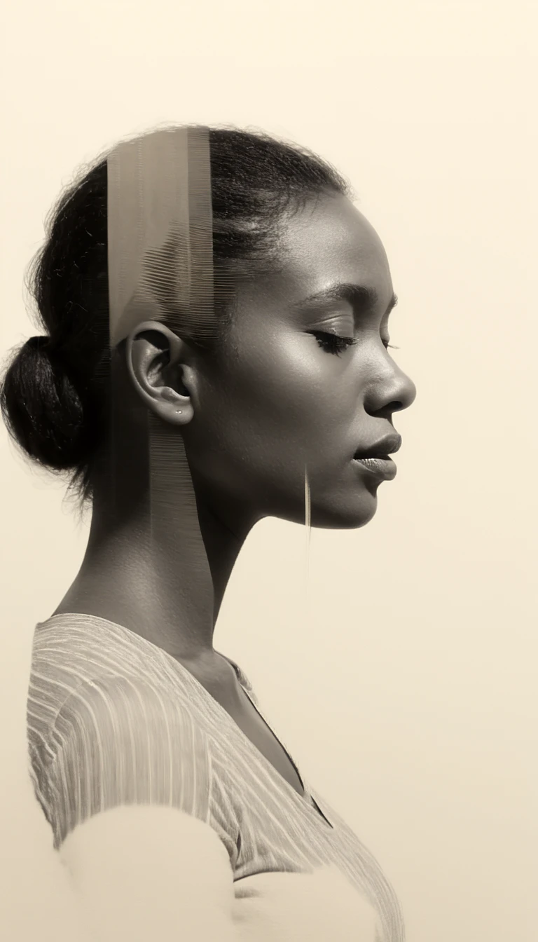 black and white photography, fashion editorial, portrait of a longhaired beautiful black woman with closed eyes in studio with double exposure soft lights, highres, realistic photo, professional photography, cinematic angle, dynamic light back shining,