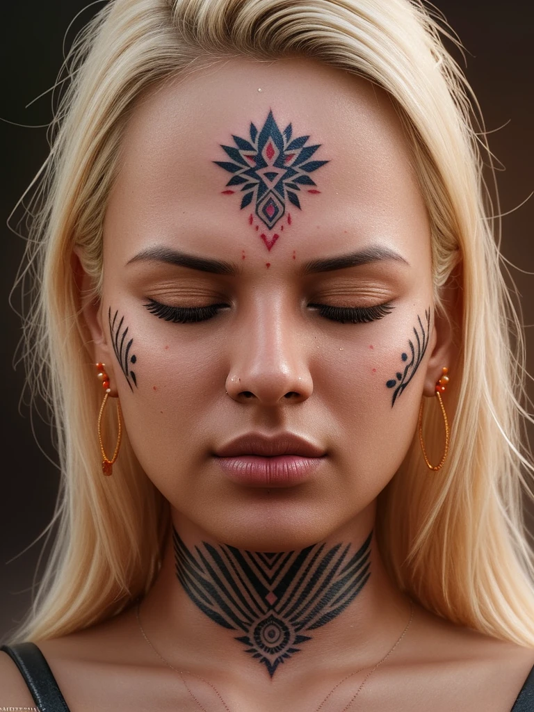 close-up portrait blonde indian, very small facial tattoo, closed eyes, luxury, bright colors, dark illumination, very detailed artwork, trending on artstation, symmetrical, cinematic, hyper realism, high definition, octane render, 8k