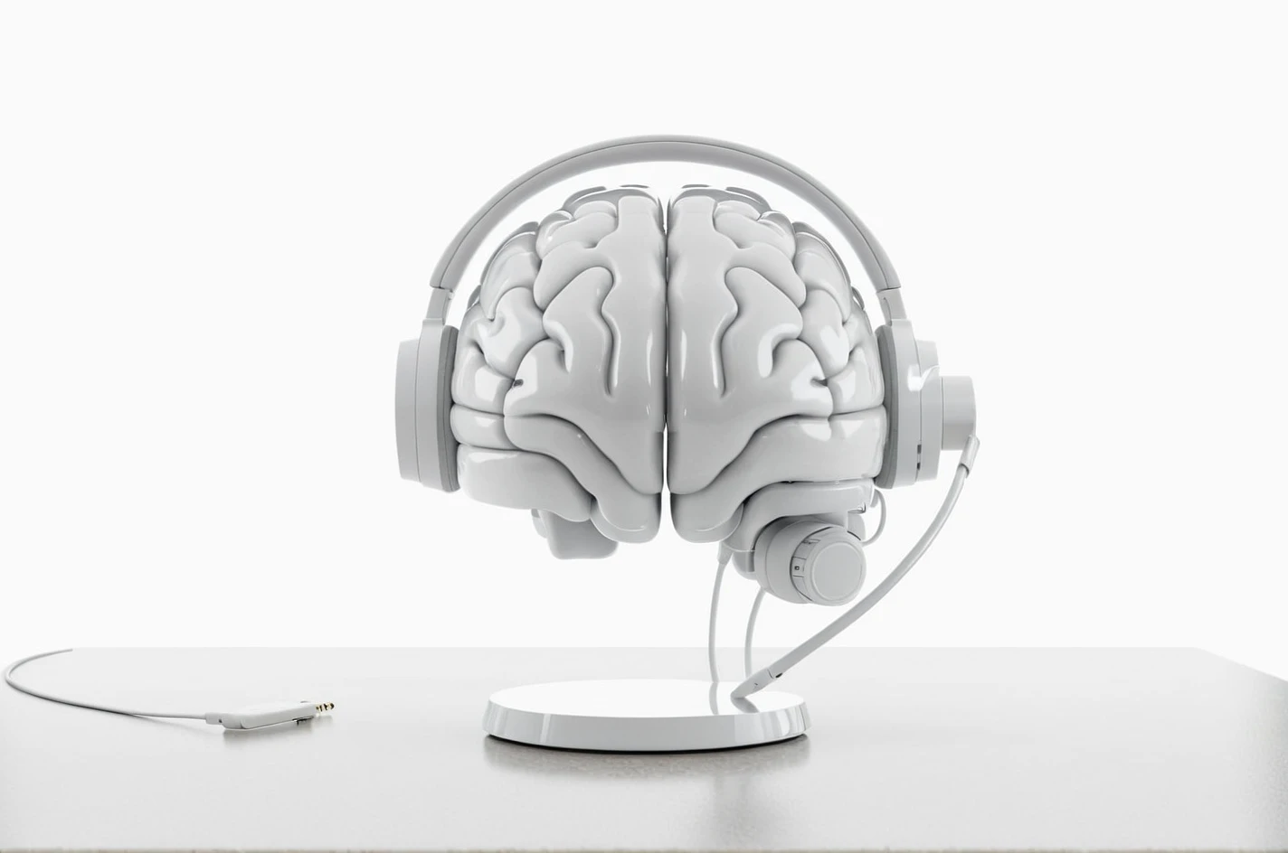 a white headphone sitting on top of a transparent brain made of translucent glass, an ambient occlusion render, inspired by Carl Gustaf Pilo, featuring brains, neurochip, without text, transparent labs, wearing a headset