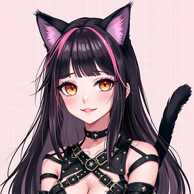 Anime-style illustration of a young, attractive female character with long dark purple-pink hair and large, expressive orange eyes. She has cat ears and a black cat tail. The character displays a serene, slightly amused expression. She is holding a longsword weapon in monsterhunter. The character's outfit is crop tank top A light pinkish-purple highlights her hair's roots. The background is a pale pink grid pattern. The lighting is soft and even, casting no strong shadows. The overall mood is gentle and playful. The composition is centered on the figure, with a slight three-quarter view showcasing her form. Focus on soft details and smooth linework. The artwork style leans towards a digital illustration. The image is vibrant and colorful, reflecting a lighthearted atmosphere.