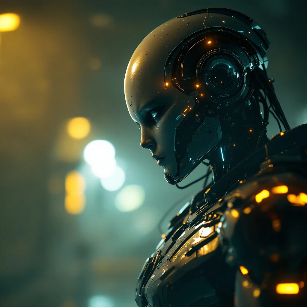 rendering, side shot, falf-strange body with complex system equipment with hyper detail robot with maine coon face, gaze, sci-fi, gloomy environment, foggy with light shader, cyan and yellow illuminations, dramatic lighting, RTX shader, hyper detail texture with reflection, HDRI, cyborg, grunge, bolt, UHD --chaos 1. 2 --ar 9:16 --style raw --stylize 750