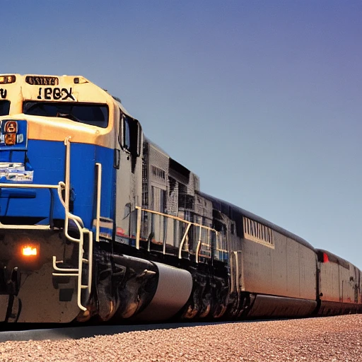 realistic photo of an emd gp38-2 locomotive machine, desert landscape, blue sky,