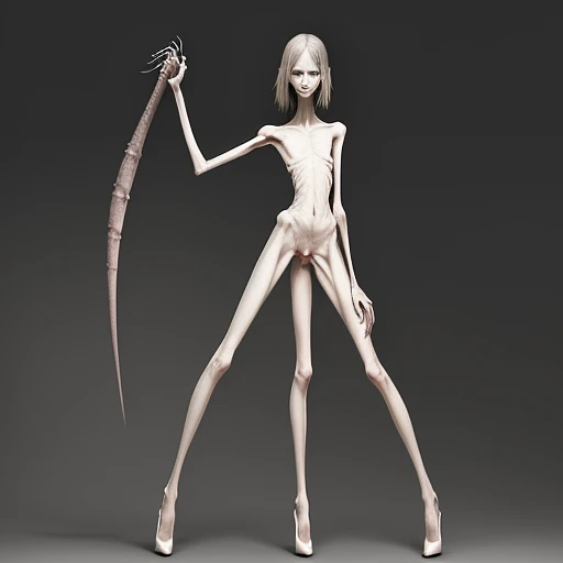 a needle-thin anorexic girl with skinny long legs and long skinny calves in high heels with long hooked claws, naked