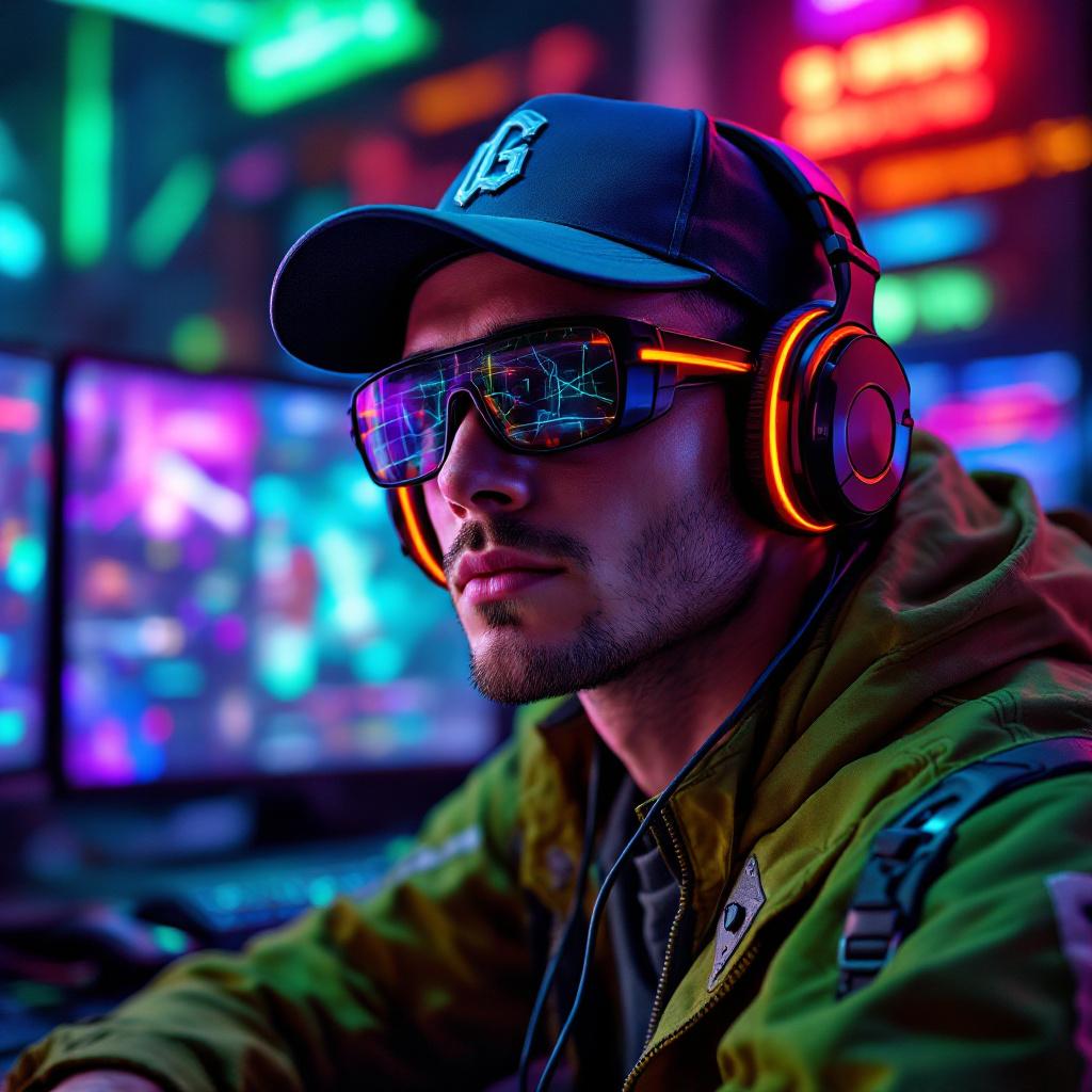 A vivid, hyper-realistic portrait of a cutting-edge gamer. He stands in front of a multi-monitor setup, bathed in the glow of neon lights. Wearing a futuristic cap, VR glasses, iPhone headphones, and a sleek green jacket with tech accents, his focused expression reflects intense concentration. The image is packed with cyberpunk details and digital art influences, creating an immersive and energetic scene.