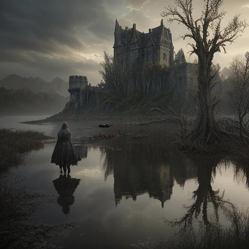 Landscape photo ultra realistic half bullfrog and half old hag woman with 4 arms in a swamp, dark fantasy, dead trees protrude from water dark castle in the far background, dramatic light, pale sunrise, cinematic lighting, battered, low angle, trending on artstation, 4k, hyper realistic, focused, extreme details, unreal engine 5, cinematic, masterpiece, art by studio ghibli, intricate artwork by john william turner