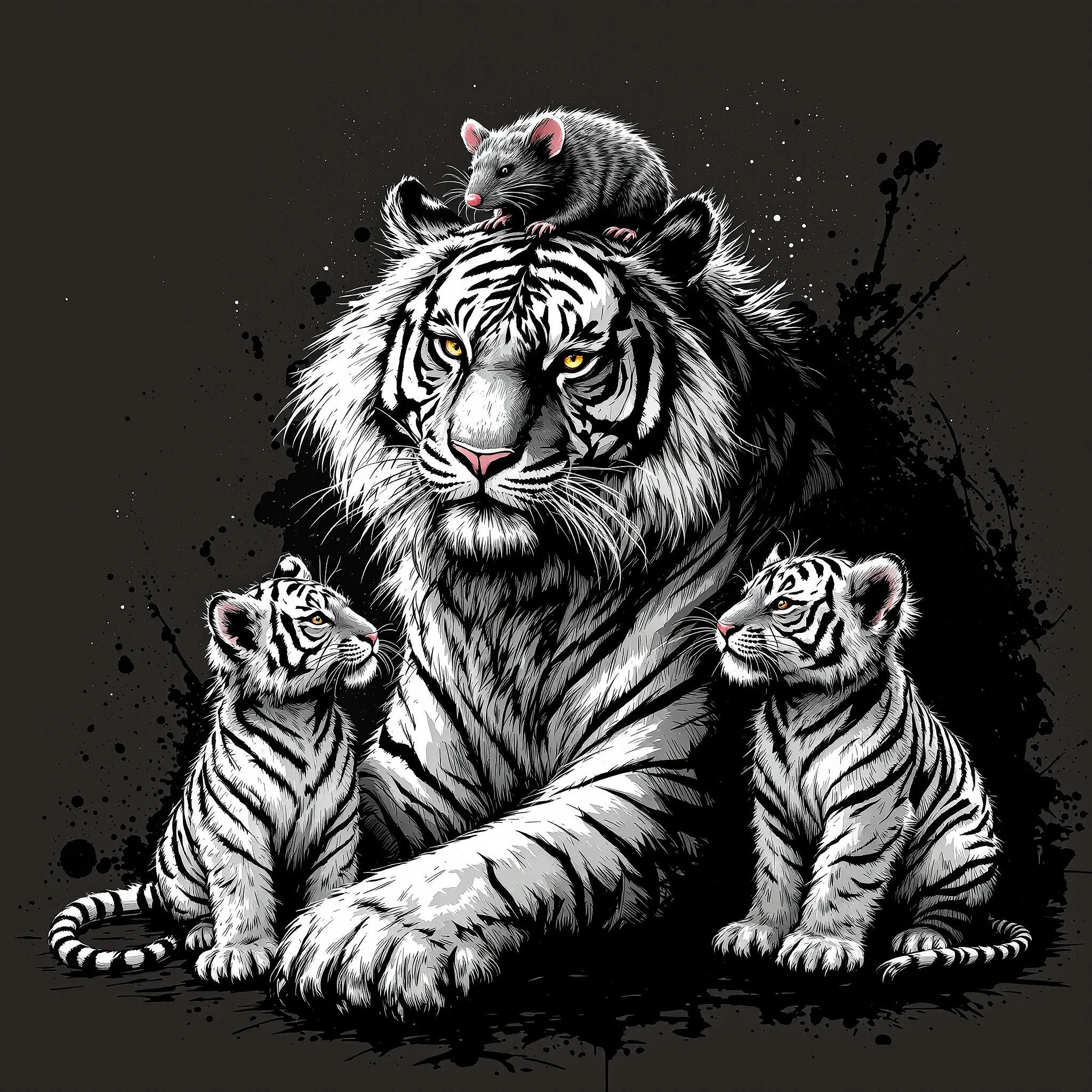 a tiger and two tiger cubs, and a oversized mouse, ferocious, detailed, full-body shots, ink style, Ink splash art on the background, ink style, The whole is on the right,Ink wraps around the body, and the ink obscures the subject, The rat sits on the head of the subject