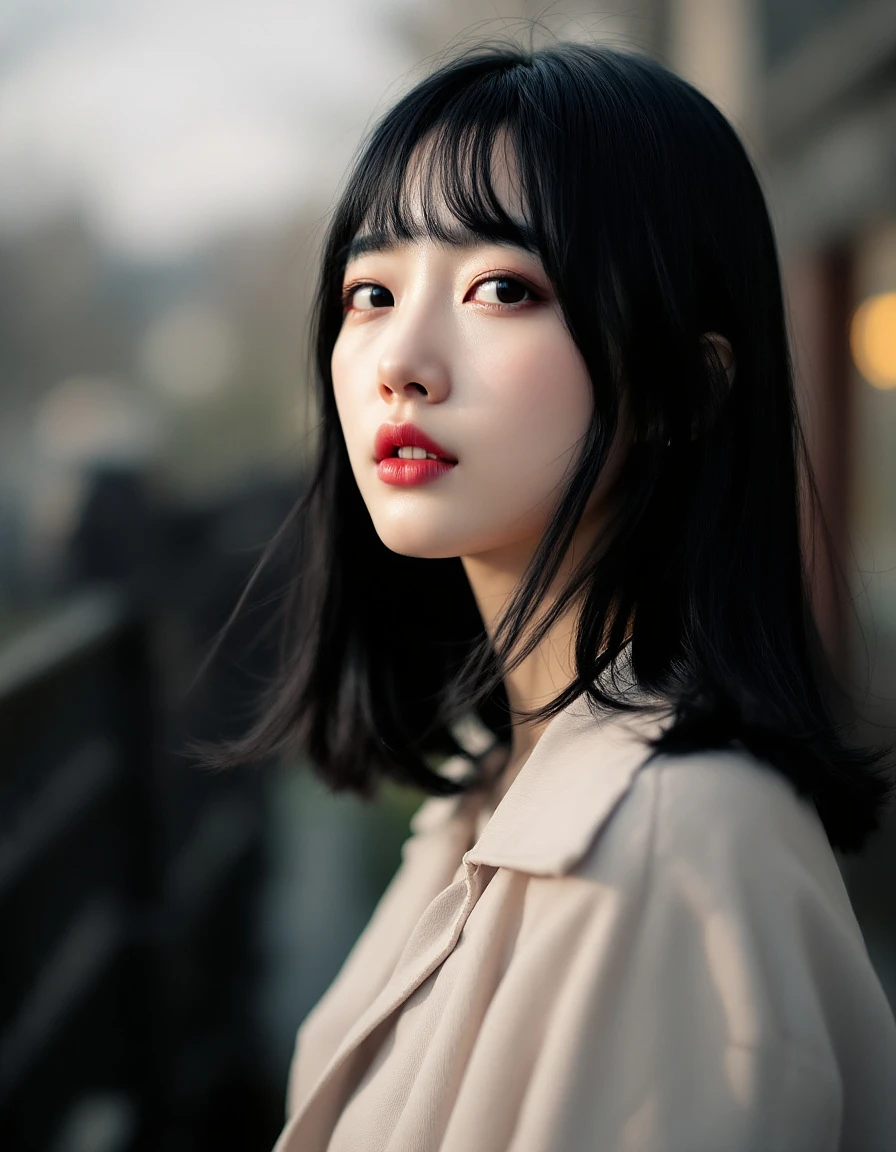 cinematic photo cowboy_shot, photograph of, asian korean woman with black hair straight hair, blunt bangs, no makeup, outdoors, masterpiece, UHD, natural light, realistic . 35mm photograph, film, bokeh, professional, 4k, highly detailed